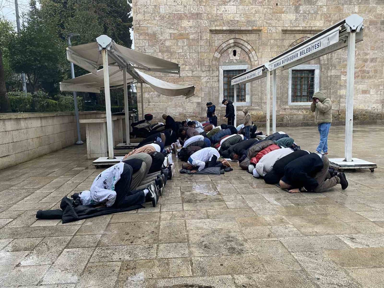 Sabahın erken saatlerinden itibaren Ulu Cami’ye gelen vatandaşlar, kısa sürede caminin içini doldurdu. Yoğunluk nedeniyle içeride yer bulamayan çok sayıda kişi, yağmura rağmen ibadetlerini avluda gerçekleştirdi. Yağışlı havaya aldırış etmeyen vatandaşlar, bayram namazını birlikte kılmanın huzurunu yaşarken, ortaya birlik ve beraberlik görüntüleri çıktı. Avluda saf tutan cemaat, yağmur altında dualar ederek bayram coşkusunu paylaştı.