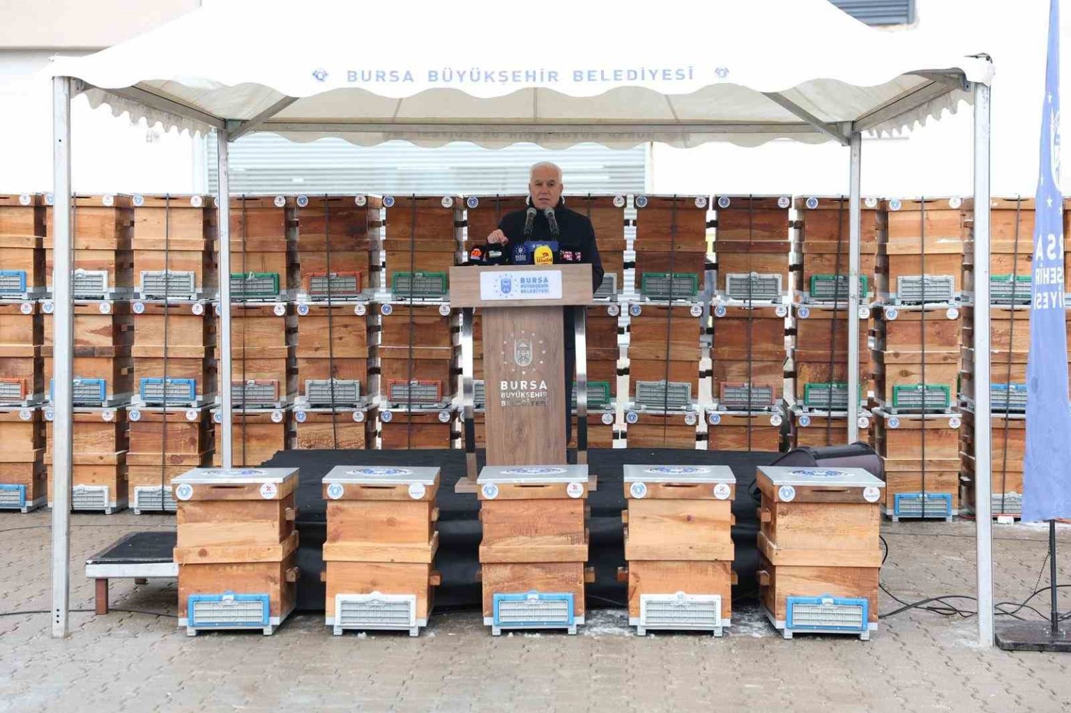 Bursa’da çiftçilerin üretmesi ve ürettiğinin karşılığını alabilmesi amacıyla projeler üreten Büyükşehir Belediyesi, Kırsal Hizmetler Dairesi Başkanlığı aracılığıyla Harmancık, Büyükorhan, Keles ve Orhaneli ilçelerinde faaliyet gösteren 66 üreticiye toplam 380 adet arı kovanı desteğinde bulundu. BURKENT Harmancık Kent Mobilyaları Üretim Tesisi’ndeki dağıtım törenine Bursa Büyükşehir Belediye Başkanı Mustafa Bozbey’in yanı sıra Harmancık Belediye Başkanı Haşim Ali Arıkan, CHP Harmancık İlçe Başkanı Mustafa Güleç, Büyükşehir bürokratları, sivil toplum kuruluşlarının temsilcileri, muhtarlar ve üreticiler katıldı.
