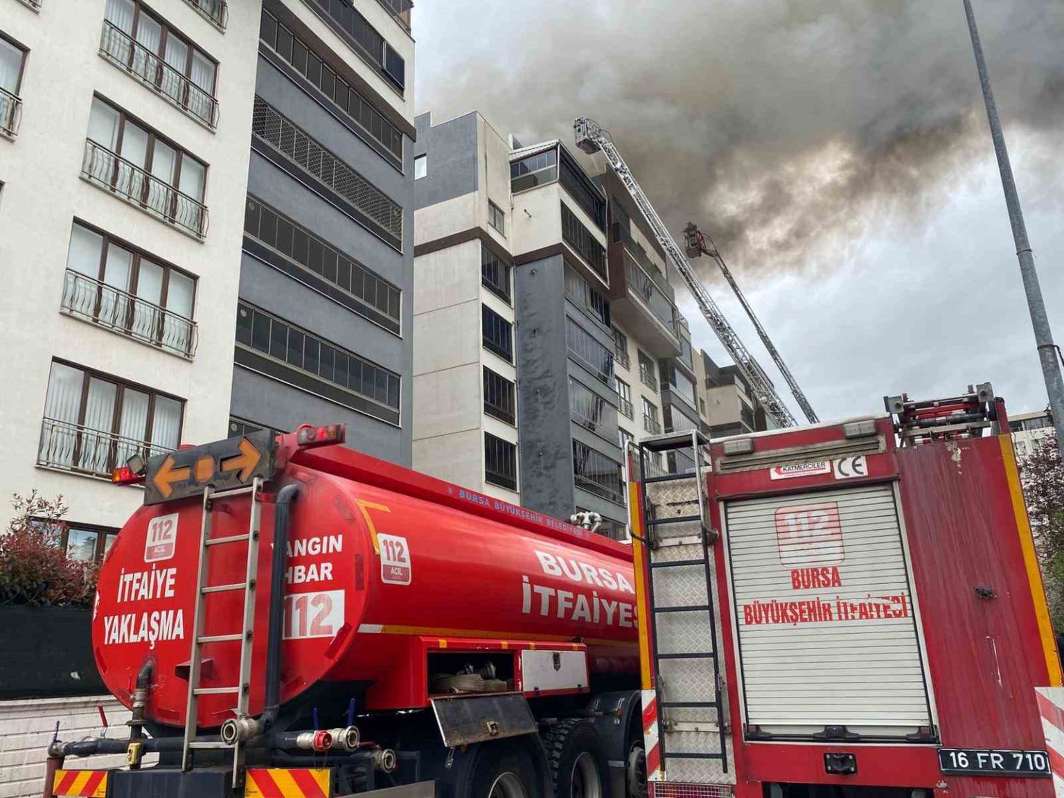 Bursa’da 6 katlı bir binanın çatı katında çıkan yangında, metrelerce yüksekte alevlerin arasında mahsur kalan bir işçinin kurtarıldığı anlar ortaya çıktı. Yangının, tadilat sırasında kullanılan yanıcı polyester ve zift malzemelerinin oluşturduğu ısı nedeniyle başladığı belirlendi. Alevler 1 saati aşkın müdahale sonrası kontrol altına alınırken, dumandan etkilenen 2 işçi hastaneye kaldırıldı. Söndürme çalışmasına 17 itfaiye aracı katıldı.