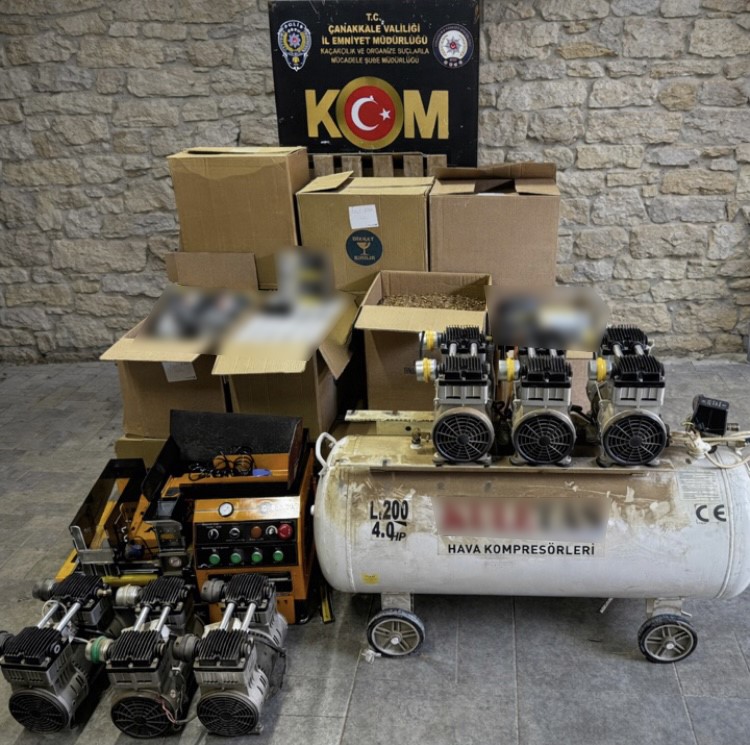 Çanakkale genelinde kaçakçılık faaliyetlerinin deşifre edilmesine yönelik yapılan çalışmalarda, 2 şüpheli şahsa ait 1 ikamet ve 1 iş yerinde yapılan aramalarda; 1 adet elektronik sigara sarma makinesi, 1 adet kompresör, 3 adet kompresör motoru, 198 bin 200 adet boş makaron, 14 bin 700 adet doldurulmuş makaron, 114 paket tütün, 12 kilo açık kıyılmış tütün ele geçirildi.