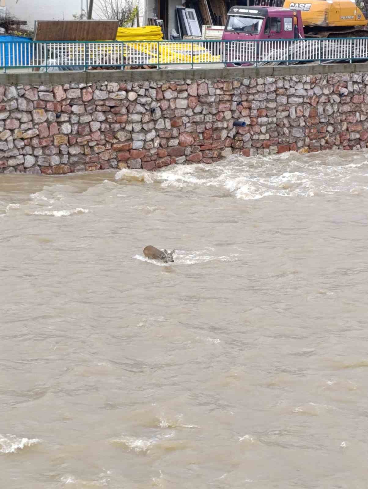 Yaralanmadığı belirlenen karaca, doğal yaşam alanına bırakıldı. Karacanın suda sürüklendiği anlar ise vatandaşlar tarafından cep telefonuyla görüntülendi.
