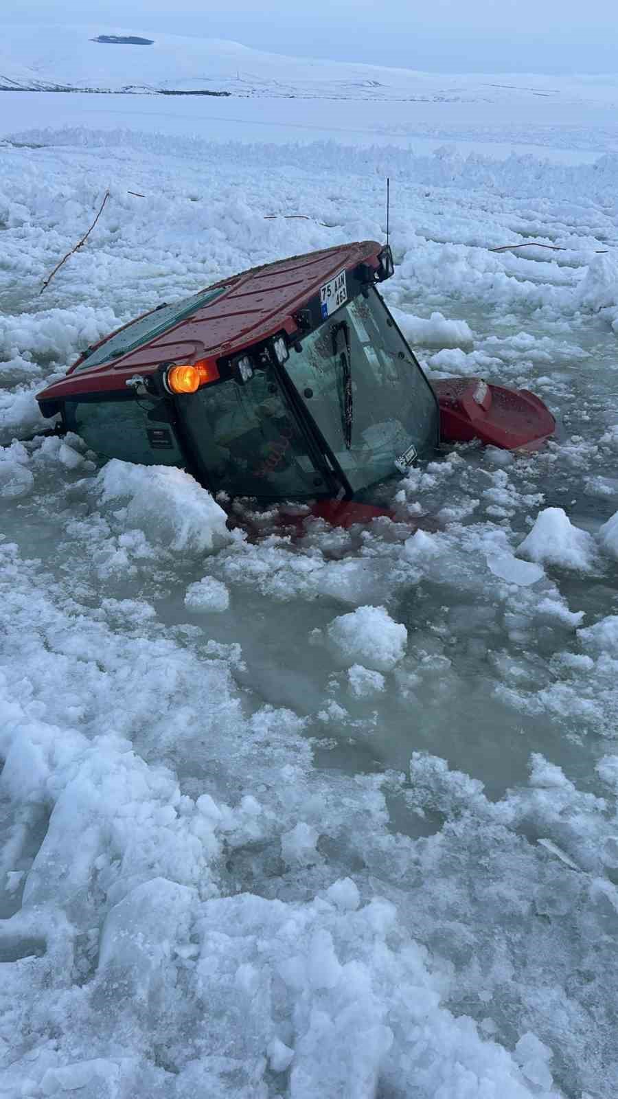 Çıldır Gölü yüzeyindeki buz kırıldı, traktör sulara gömüldü