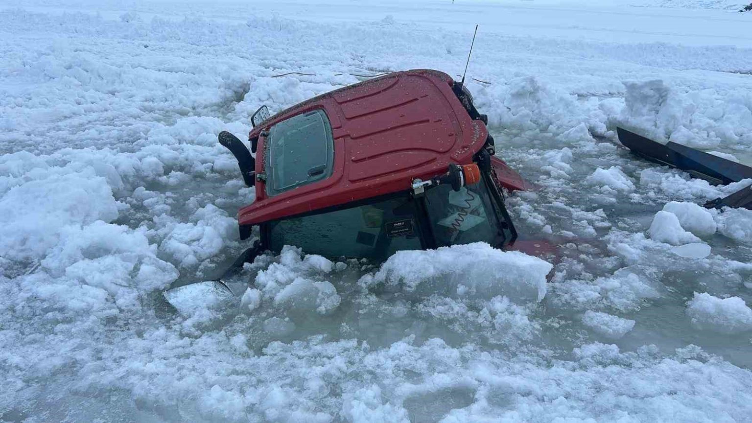 Ardahan’ın Çıldır ilçesindeki yüzeyi buz tutan Çıldır Gölü üzerinde kar temizleme çalışması yapan traktör, buzun kırılması sonucu suya gömüldü, sürücü son anda kurtarıldı.