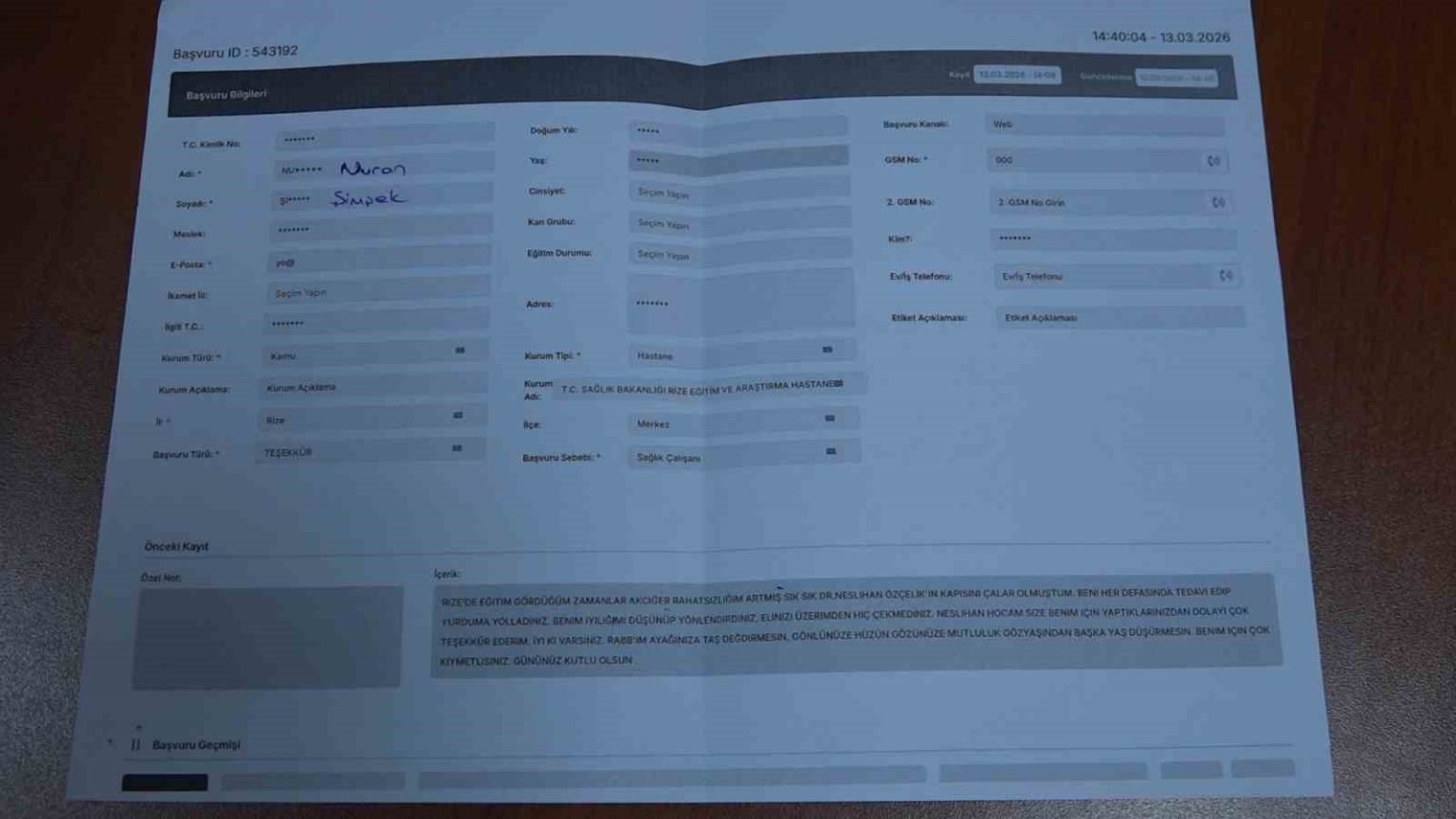 Rize’de öğrenim gördüğü sırada rahatsızlanarak akciğer yetmezliği olduğunu öğrenen 21 yaşındaki genç kız, tedavi sürecinde kendisiyle ilgilenen doktoruna minnettarlığını daha çok şikayet ve talepler için kullanılan CİMER üzerinden teşekkür mesajı yazarak iletti.