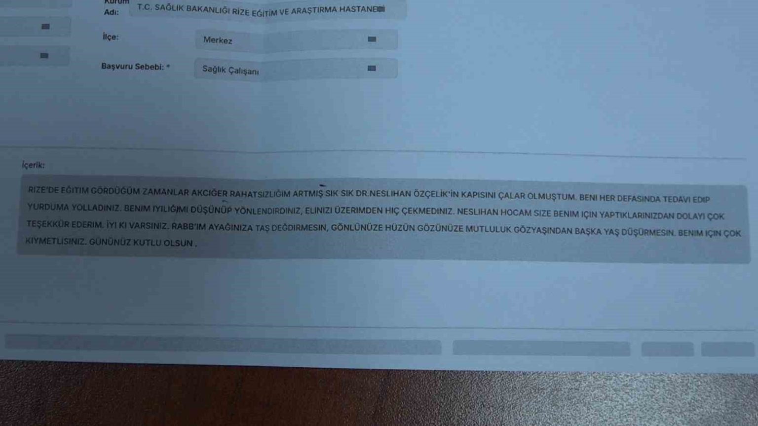 CİMER’e yazdığı mesajda duygularını samimi ifadelerle aktaran Şimşek, “Rize’de eğitim gördüğüm zamanlar akciğer rahatsızlığım artmış, sık sık Dr. Neslihan Özçelik’in kapısını çalar olmuştum. Beni her defasında tedavi edip yurduma yolladınız. Benim iyiliğimi düşünüp yönlendirdiniz, elinizi üzerimden hiç çekmediniz. Neslihan hocam size benim için yaptıklarınızdan dolayı çok teşekkür ederim. İyi ki varsınız. Rabb’im ayağınıza taş değdirmesin, gönlünüze hüzün gözünüze mutluluk gözyaşından başka yaş düşürmesin. Benim için çok kıymetlisiniz” sözlerine yer verdi.