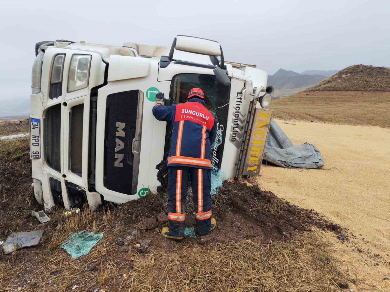 Çorum’un Sungurlu ilçesinde virajı alamayarak devrilen tırın sürücüsü yaralandı.