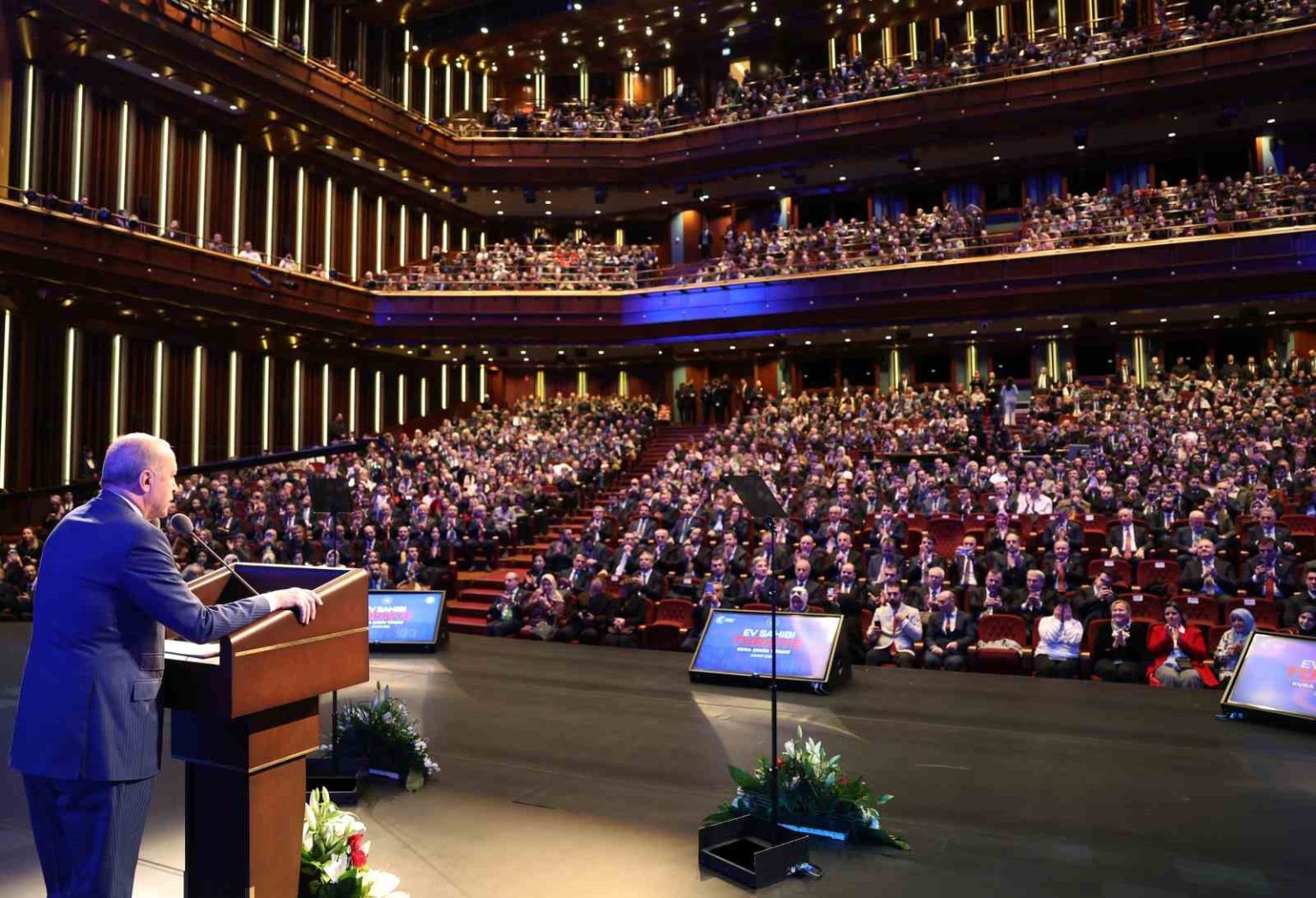 Yaşanan 6 Şubat depremlerinin ardından bölgedeki toplu konut projelerinin söz verildiği gibi yapıldığını ve deprem bölgesinde yaşananların siyasete malzeme edildiğini söyleyen Cumhurbaşkanı Erdoğan, “Değerli kardeşlerim şehircilikte en büyük başarı hikayesini deprem bölgemizde yazdık. Milletimize verdiğimiz sözü tutarak 3 yıl içinde tam 455 bin 327 bağımsız bölümü tamamladık. 455 bin konutun altyapı masraflarının tamamını devlet olarak biz üstlendik. Ve kalan fiyat üzerinden vatandaşlarımıza yüzde 50 indirim yaptık. Ayrıca depremzedelerimiz için çok rahat ve oldukça avantajlı bir ödeme planı oluşturduk. Buna göre yeni evlerine yerleşecek vatandaşlarımız ilk iki yıl boyunca hiç ödeme yapmayacak. Devamında ise 18 yıla yayılan sabit ve çok düşük bedelli taksitlerle zorlanmadan ödemesini gerçekleştirecek. Peşin ödemek isteyen vatandaşlarımız da meclisimizde yapacağımız düzenlemeyle neredeyse dörtte biri fiyatına ev sahibi olacak. Kredi kullanmayı planlayan kardeşlerimize ise kamu bankalarımız gerekli kolaylıkları sağlayacak. Bir kez daha hayırlı uğurlu olsun diyorum. Hak sahibi kardeşlerimizin ödeme miktarları ve takviminden çok memnun olduğunu bizler için hayır dualar ettiğini biliyorum. Bizleri milletimize mahcup etmeyen Cenabı Allah’a hamdolsun diyoruz. Asrın felaketini yaşadığımız günlerde devlet ve millet olarak yeniden ayağa kalkmaya çalışırken ana muhalefet partisi başta olmak üzere bulanık suda balık avına çıkıp selden kütük kapma yarışına girenlere, depremzedelerimizin acısını ahlaksızca istismar etmeye girişenlere meydanlarda içi boş vaatlerde halkımızı kandırmaya çalışıp ’bedava ev, bedava iş yeri, bedava traktör’ sözleri verenlere iktidarımızın ve ittifakımızın enkaz altında kalması için kendilerini seferber edenlere ezcümle deprem turistlerinin tamamına böylece en güzel cevabı vermiş olduk. Bu vesileyle devletine güvenen, milletine inanan, o imtihan günlerinde ümit ve metanetini koruyarak bizlere destek olan tüm kardeşlerime bir kez daha canıgönülden teşekkür ediyorum. 6 Şubat’ta ebediyete uğurladığımız kardeşlerimize Allah’tan rahmet niyaz ediyor. Geride kalanlara başsağlığı diliyorum. Rabbim bizleri bir daha böyle büyük acılarla, afetlerle sınamasın diye dua ediyorum” diye konuştu.
