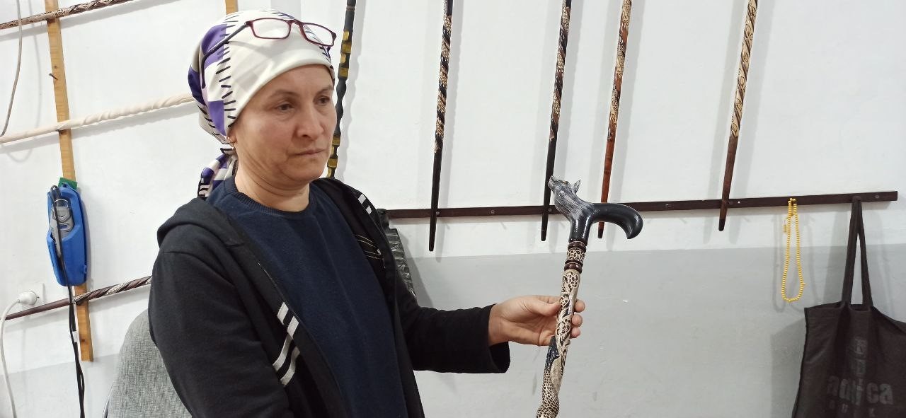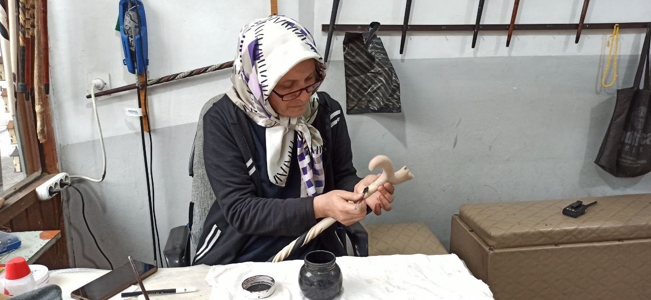 Devrek’te yaşayan Fatma Ayvacı, bir yandan evinin işlerini yürütürken diğer yandan atölyede kızılcık ağacına şekil veriyor. 2003 yılından bu yana eşine yardım ederken mesleği öğrenen ve ustalaşan Ayvacı, kadın elinin değdiği bastonların inceliklerini anlattı.