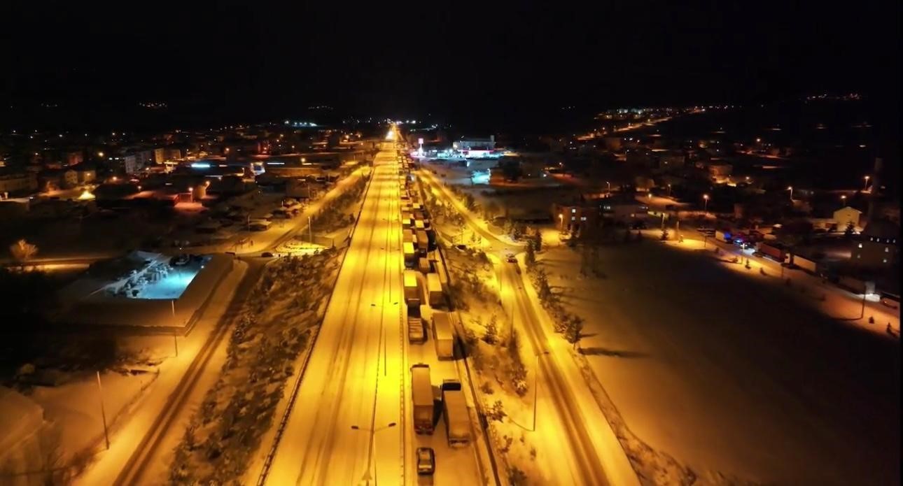 Çankırı’nın Çerkeş ilçesinde, İstanbul’u Karadeniz’e bağlayan D-100 karayolu, yoğun kar yağışı ve buzlanma sebebiyle ulaşıma kapandı. İstanbul istikametinde seyir halinde olan araçlar, zemini kaplayan kar ve buzlanma sebebiyle saatlerce mahsur kaldı. Uzun kuyruklar oluşan kara yolunda sürücüler kontak kapatırken, vatandaşlar belediyenin tahsis ettiği kültür merkezinde ihtiyaçlarını giderebildi. Ekipler, ulaşımın yeniden sağlanabilmesi için çalışmalarını sürdürüyor.