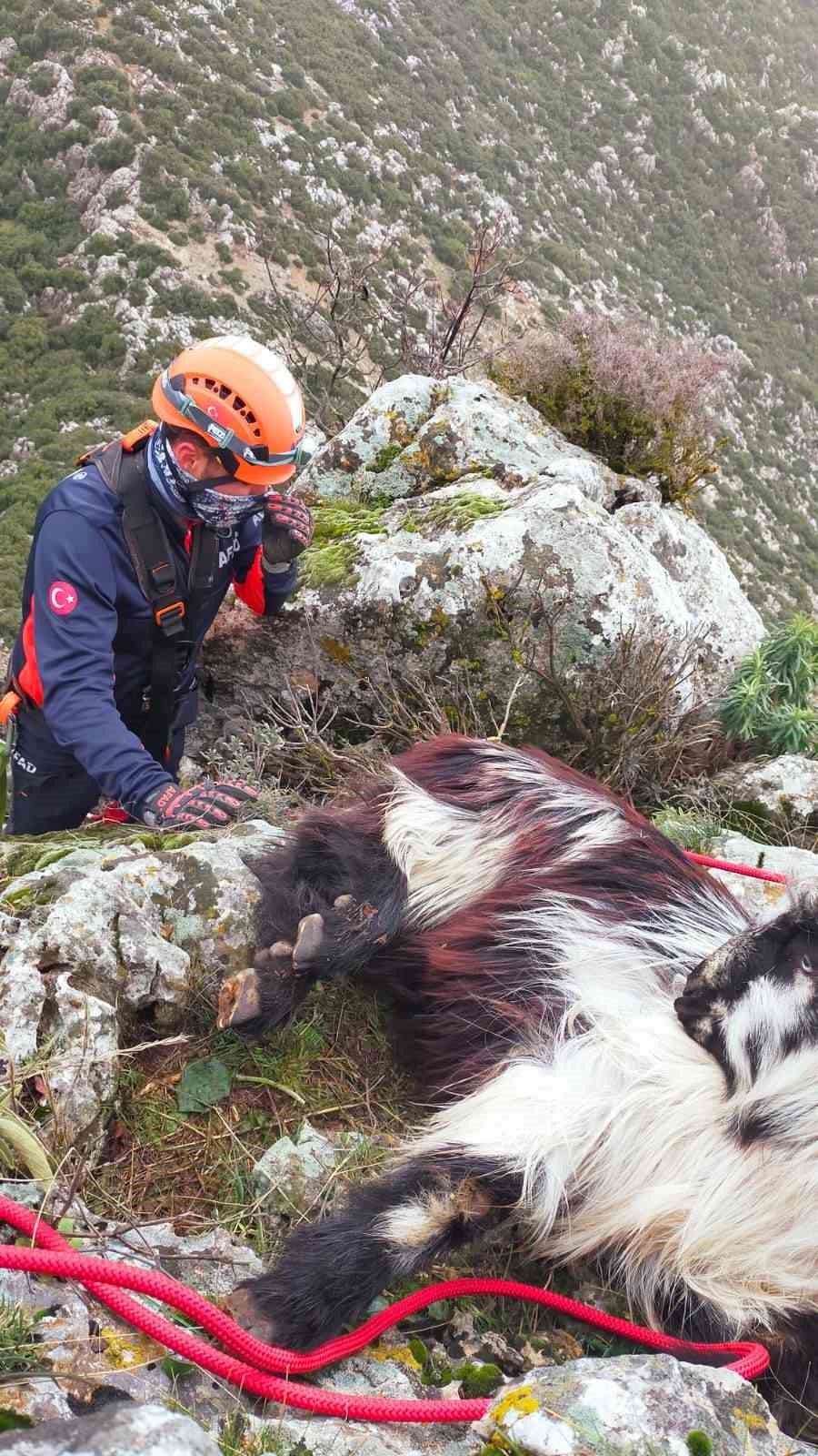 Dağda mahsur kalan keçi ekiplerce kurtarıldı
