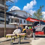 Antalya’da inşaat iskelesinden üst kata çıkarken düşerek yaralanan işçi itfaiye ekiplerince vinçle bulunduğu yerden kurtarıldı.