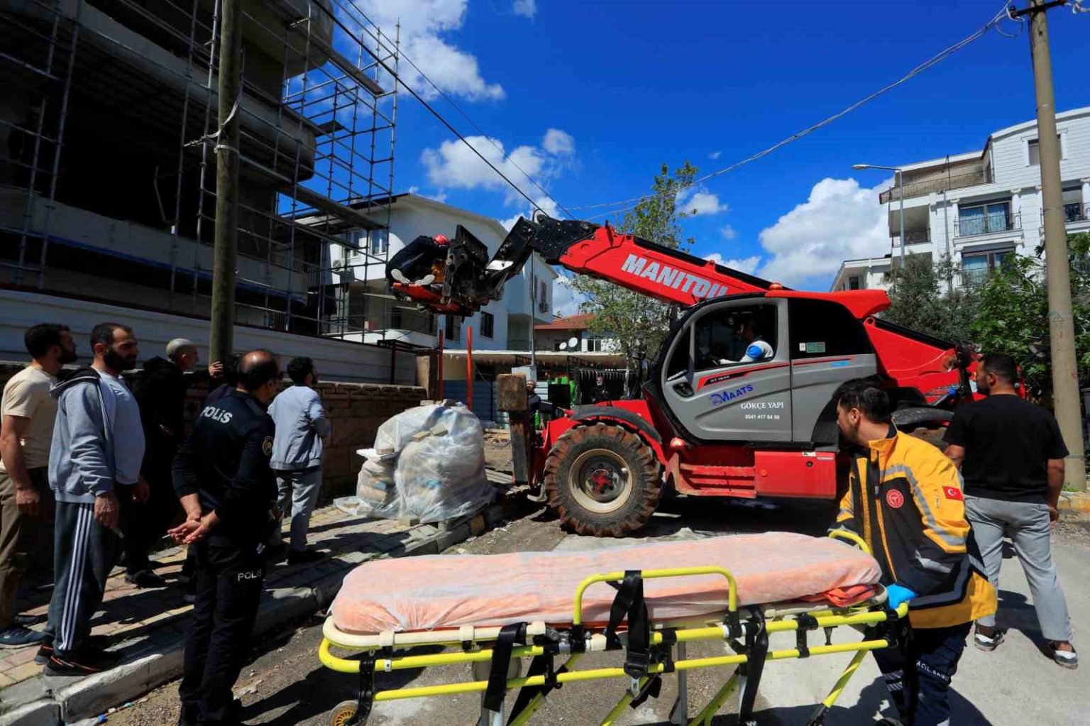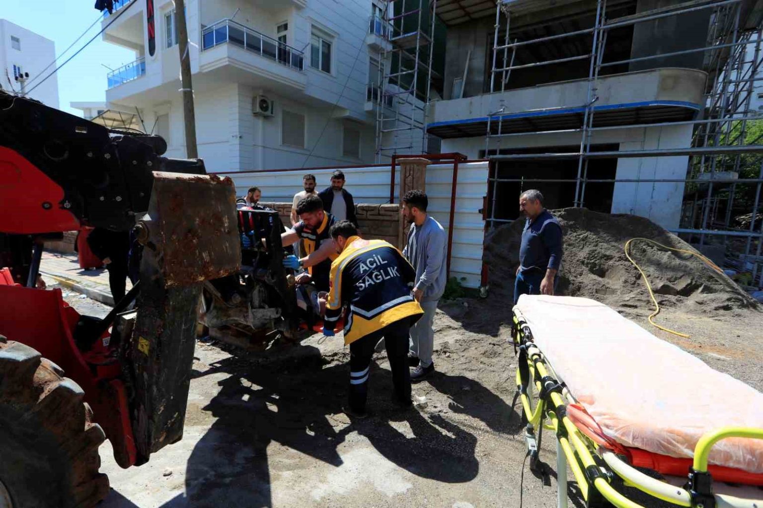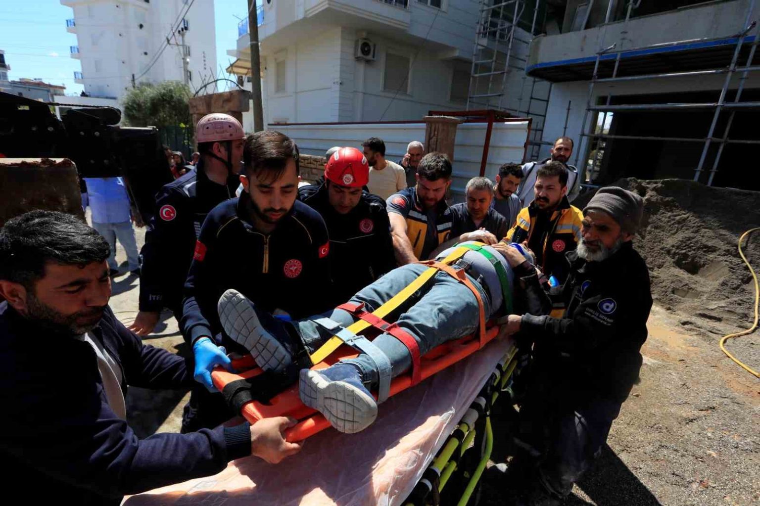 İnşaatta merdiven bulunmaması nedeniyle mesai arkadaşları yaralı işçiyi aşağıya indiremeyince olay yerine itfaiye, sağlık ve polis ekipleri sevk edildi. Verilen adrese gelen sağlık ve itfaiye ekipleri Maşallah E.’ye ilk müdahaleyi olay yerinde yaptı. Yaralı işçiyi bulunduğu yerden indirmek için çalışma başlatan itfaiye ekipleri Maşallah E.’yi ilk olarak kaşık sedyeye sabitledi. Olay yerine çağrılan vinç yardımıyla bulunduğu yerden indirilen ve vücudunun çeşitli yerlerinde kırıklar olduğu öğrenilen yaralı işçi sağlık ekipleri tarafından ambulansa alınarak Kepez Devlet Hastanesi’ne kaldırıldı.