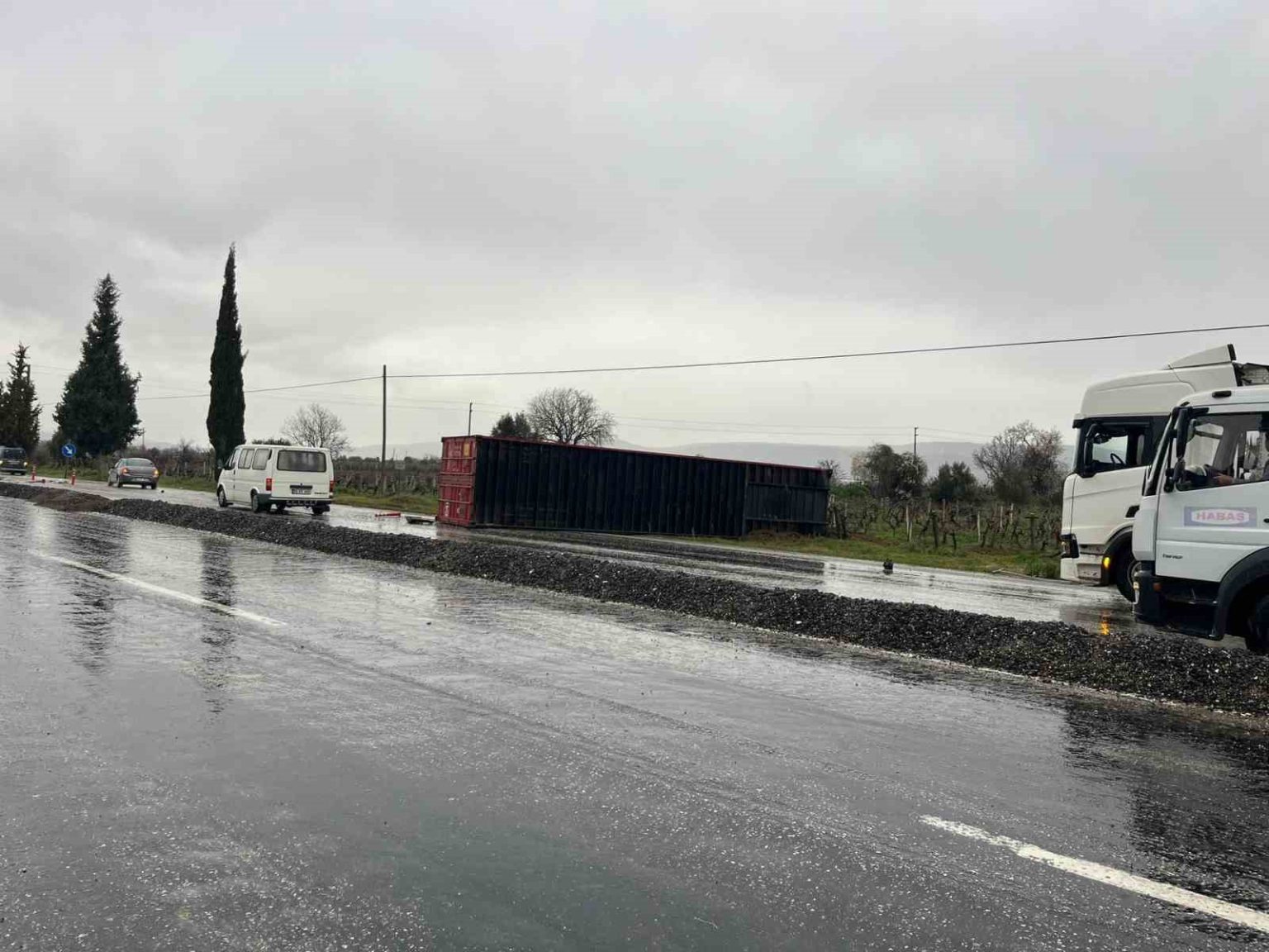 Denizli’de etkili olan yağmur, trafik kazasını beraberinde getirdi. Denizli-Salihli karayolu üzerinde meydana gelen kazada, kayganlaşan yolda kontrolden çıkan bir TIR’ın dorsesi yola savruldu.