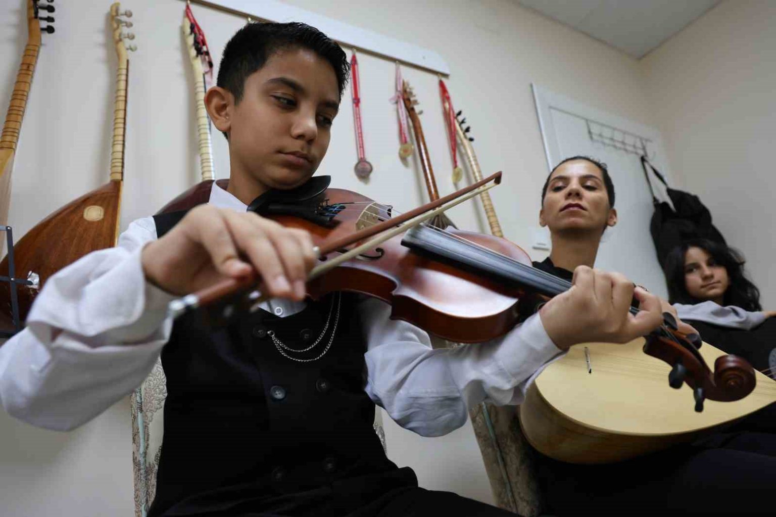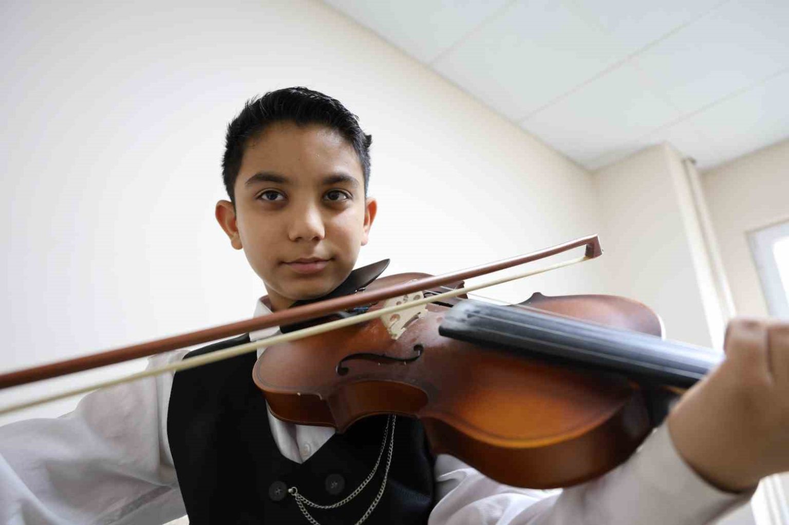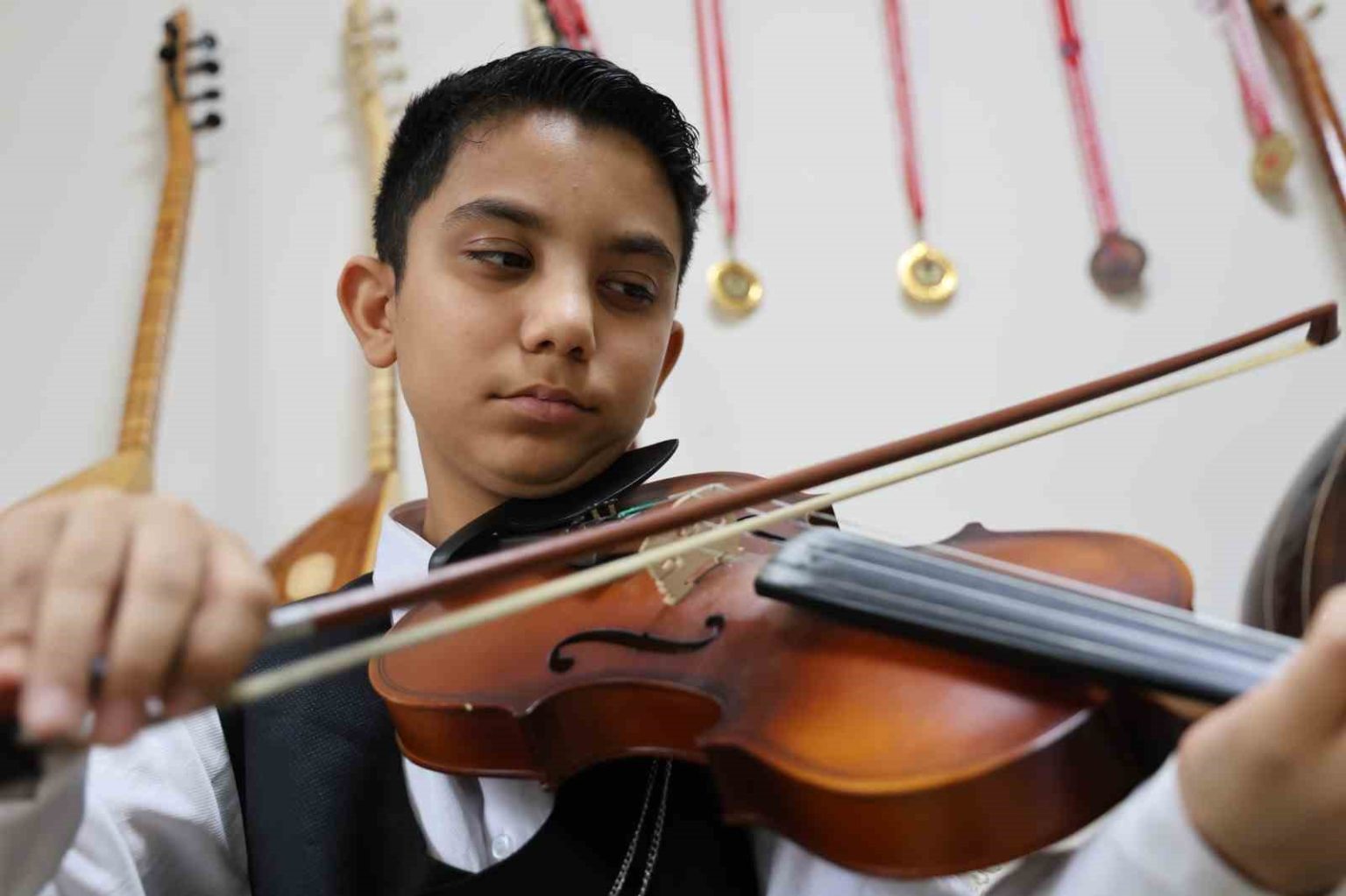 Deprem sonrası kemanla tanıştığını ifade eden Çınar Kaplan, “12 yaşındayım, altıncı sınıfa gidiyorum ve keman çalıyorum. Benim keman çalma serüvenim birkaç yıl önce depremle başladı. Elazığ depremi olduğunda bizim ev hasar aldı ve konteynere taşınmak zorunda kaldık. Bir süre sonra pandemi geldi, Covid-19 derken sokağa çıkma yasakları başladı ve sürekli evdeydik. Çok sıkılıyorduk. O dönemde Onur Şahin çocukları kötü alışkanlıklardan uzak tutmak için enstrüman dersleri veren kurs açtı. Bunu duyunca çok sevindik ve hemen başvuru yaptık. Sağ olsun kabul etti. Aslında annem beni bağlamaya yazdıracaktı ama ben keman istedim. Annem kemanın zor olduğunu söyledi ama ben denemek istedim. İki üç ay kursa gittim. Orada hocam bana öğretti. Üç aylık kurs bitince ve devam edecek imkanımız olmadığı için okullar da açılınca kursa gidemedim. Okuldan geldikten sonra evde internetten ve telefondan videolar izleyerek kendi kendime çalıştım ve kemanı devam ettirmeye çalıştım” şeklinde konuştu.