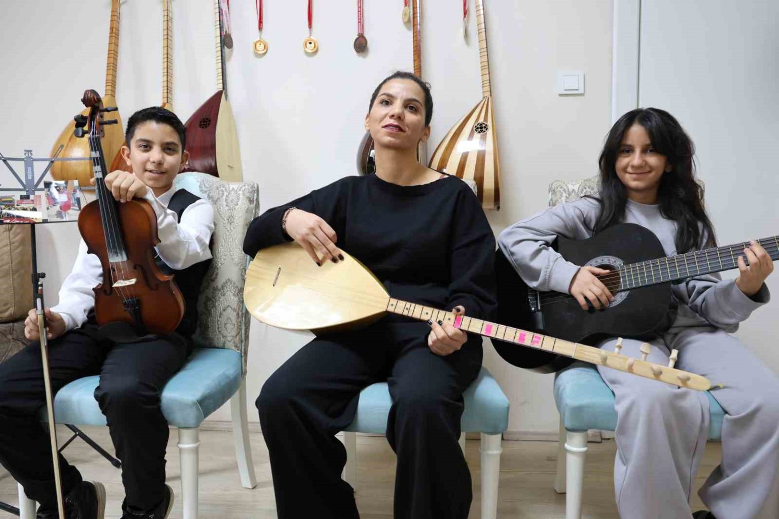 Müziğe başlama süreçlerini anlatan anne Başak Kaplan, “5 çocuk annesiyim, 32 yaşındayım. Oğlum, kızım ve ben müziğe karşı oldukça ilgiliyiz. Aslında müzik benim çocukluğumdan gelen bir şey. Çocukluğumda içimde bir ukde kalmıştı. O dönemin şartları, yaşam koşulları ne yazık ki bize bu fırsatı vermedi. Biz çocuklarımla müziğe depremden sonra başladık. Biliyorsunuz çoğu ev yıkıldı, çoğu ev hasar gördü. Biz de depremzedelerden biriydik ve konteynerde yaşamaya başladık. Kısa bir süre sonra pandemi geldi, Covid-19 derken sokağa çıkma yasakları başladı ve sürekli evdeydik. Çok sıkılıyorduk. O dönemde Elaziz Kültür Eğitim ve Yardımlaşma Derneği tarafından Onur Şahin, çocukları uyuşturucudan, sigaradan ve kötü alışkanlıklardan uzak tutmak için enstrüman dersleri veren kurs açtı. Bunu duyunca çok sevindik ve hemen başvuru yaptık. Sağ olsun, isteğimizi kabul etti ve orada müziğe başladık. Üç aylık kurs ücretsizdi. Kurs bitince ve okullar açılınca özel kurslara devam edecek imkanımız olmadı. Şu an bulunduğumuz kurum, Sosyal Yardımlaşma ve Dayanışma Vakfı Aile Destek Merkezi (ADEM). Vakıf Müdürü Tayyip Özer beyin öncülüğünde ve destekleriyle burada sadece ders veya kurs görmüyoruz. Aynı zamanda psikolojik, maddi ve manevi gibi her türlü desteği görüyoruz. Oğlum kemanda aşırı derecede yetenekli, evde kendi kendine geliştirdi. Kızım da gitar çalıyor ama asıl alanı spor. Gitarı daha çok hobi olarak sürdürüyor. Sporda birçok dalda belgelerimiz ve madalyalarımız var. Okçulukta il birincisi oldu. Fırat Üniversitesi Toplum Destekli Polislik birimi tarafından da ödüllendirildik” dedi.