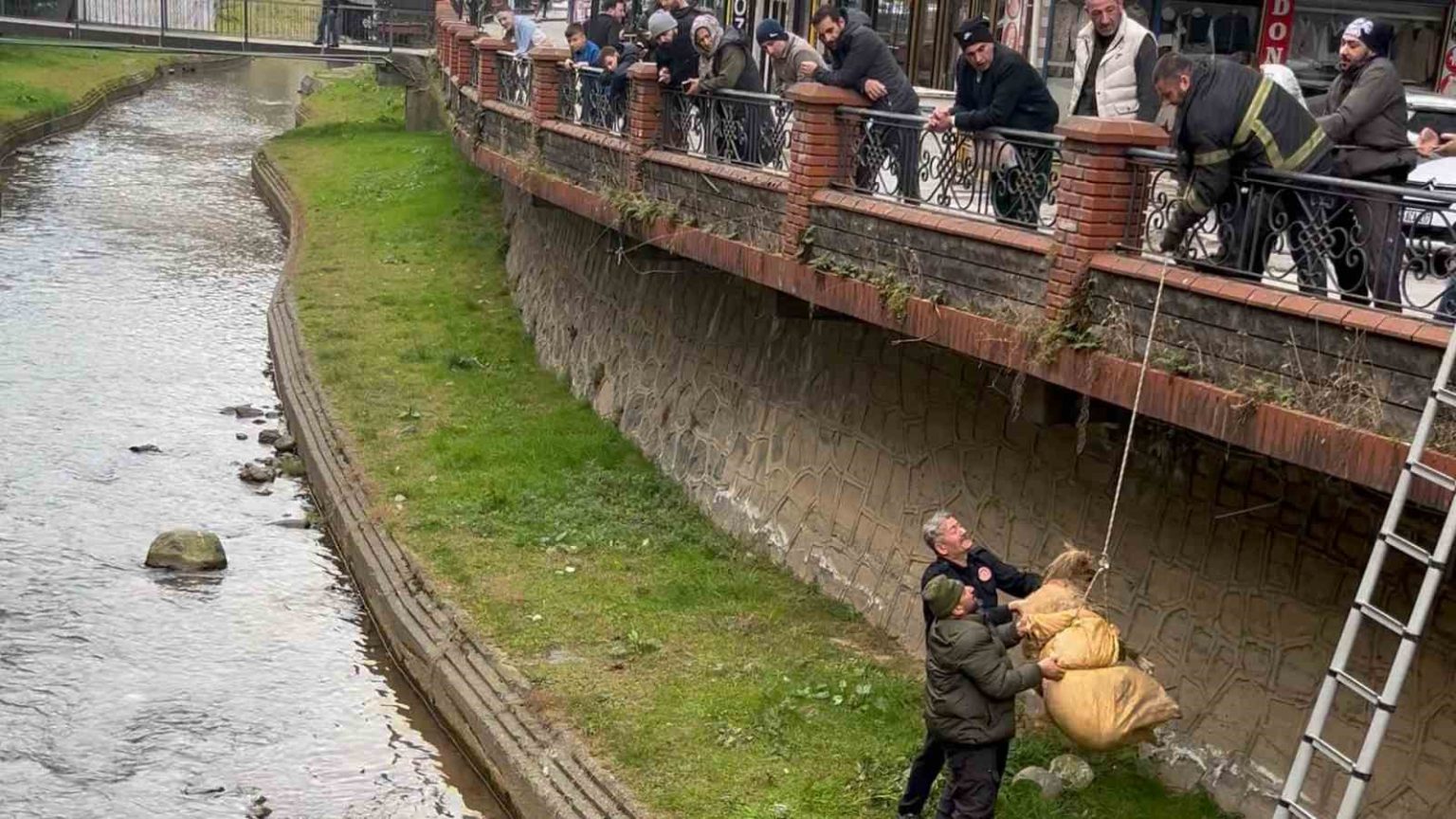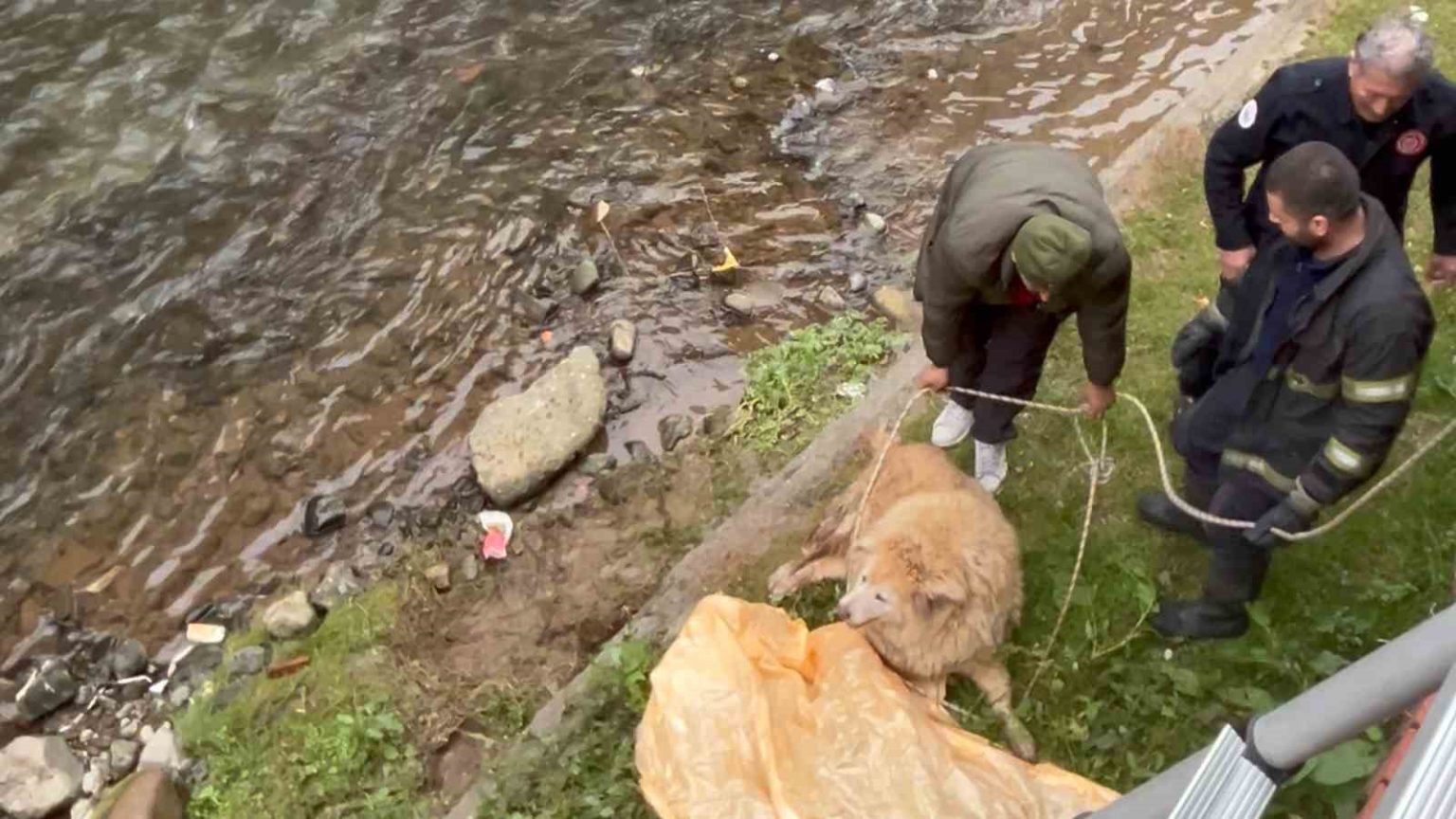 Olay, Ardeşen ilçesine bağlı Merkez Mahallesi’nden geçen Dolana Deresi’nde sabah saatlerinde meydana geldi. Edinilen bilgiye göre, dün geceden bu yana dere yatağında mahsur kaldığı tahmin edilen sokak köpeğini fark eden vatandaşlar, durumu itfaiye ekiplerine bildirdi. İhbar üzerine kısa sürede olay yerine gelen Kaçkar İtfaiyesi ekipleri, çevrede bulunan vatandaşların da desteğiyle kurtarma çalışması başlattı. Oldukça kilolu olan köpek, bez brandaya bağlanarak halat yardımıyla dere yatağından güvenli bir şekilde çıkarıldı.