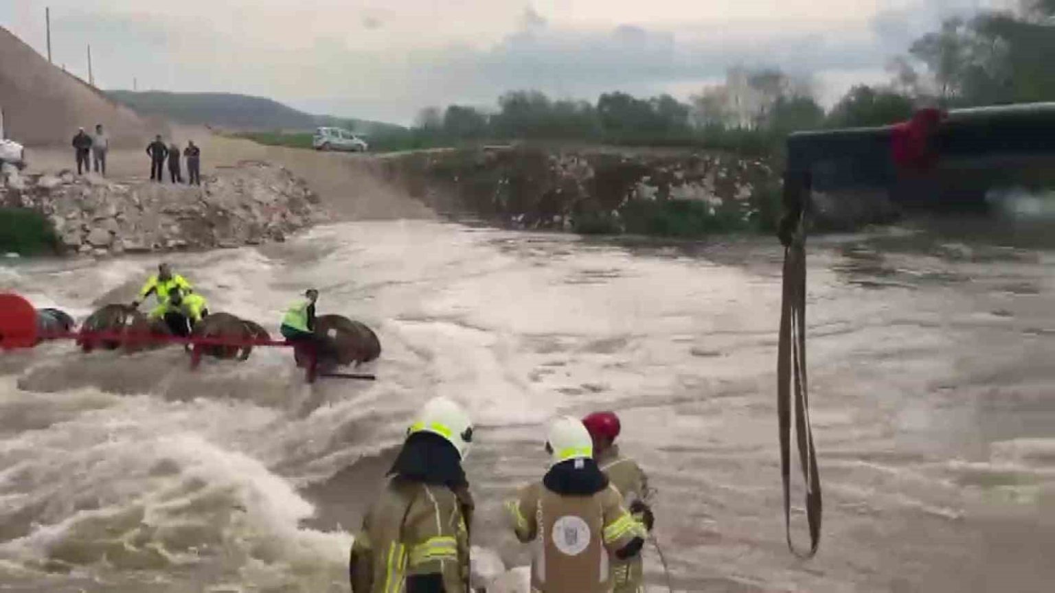 Bursa’nın Yenişehir ilçesinde Kocasu Deresi’nden traktörle karşıya geçmek isteyen 10 işçinin bulunduğu traktör, suyun ortasında devrildi. Akıntının etkisiyle dengesini kaybeden traktördeki işçiler dere içinde mahsur kaldı.