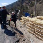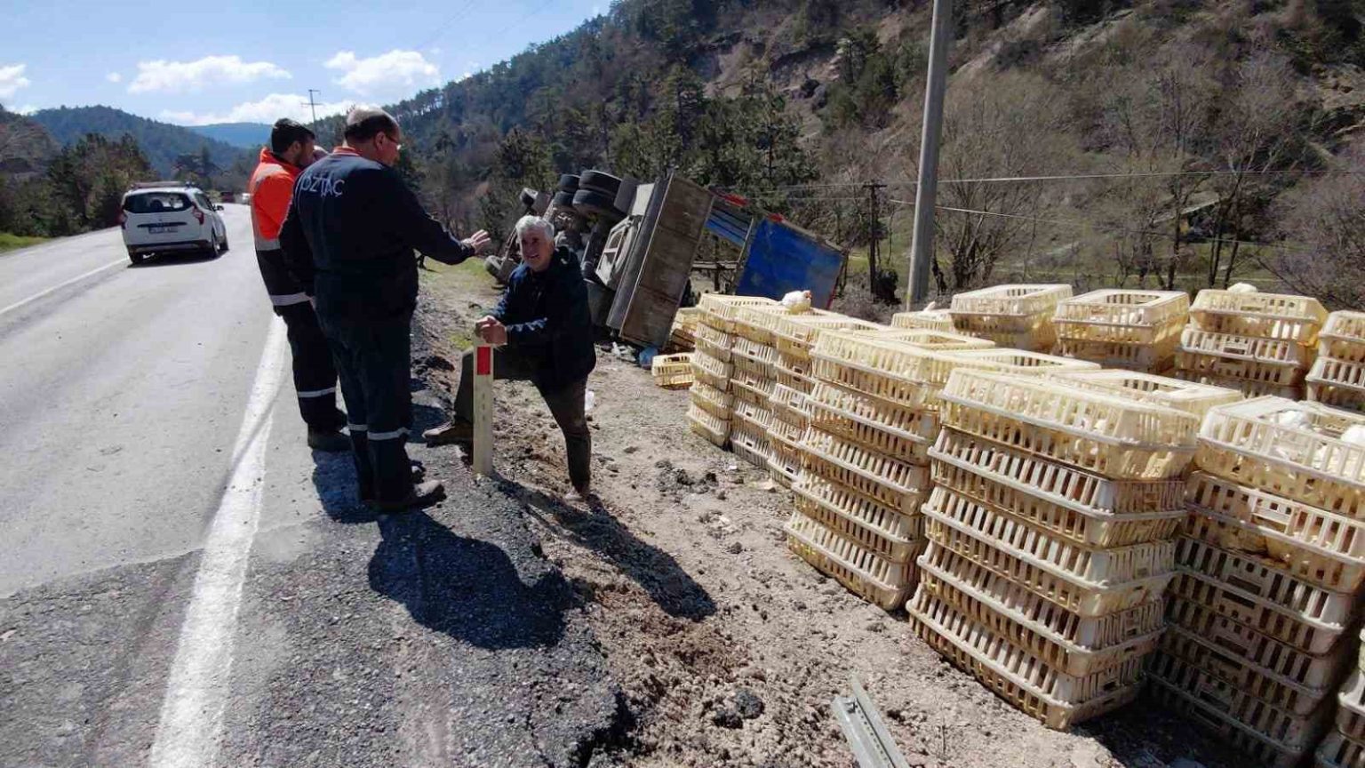 Bolu’nun Mudurnu ilçesinde canlı tavuk yüklü kamyon virajı alamayarak devrildi. Sürücünün yara almadan atlattığı kazada, araç kasasındaki onlarca tavuk telef oldu.