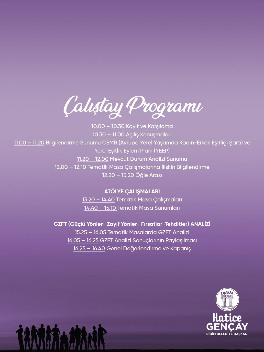 Didim Belediye Başkanı Hatice Gençay, “Eşitlik, güçlü ve sürdürülebilir bir toplumsal yaşamın temelidir. Kadınların, gençlerin ve tüm bireylerin eşit fırsatlara sahip olduğu bir kent inşa etmek için çalışmalarımızı ciddiyetle ve kararlı bir şekilde sürdürüyoruz. Yerel Eşitlik Eylem Planı ile Didim’de daha kapsayıcı ve adil bir yaşamı birlikte inşa edeceğiz. Tüm halkımızı bu önemli buluşmaya davet ediyorum” ifadelerini kullandı.