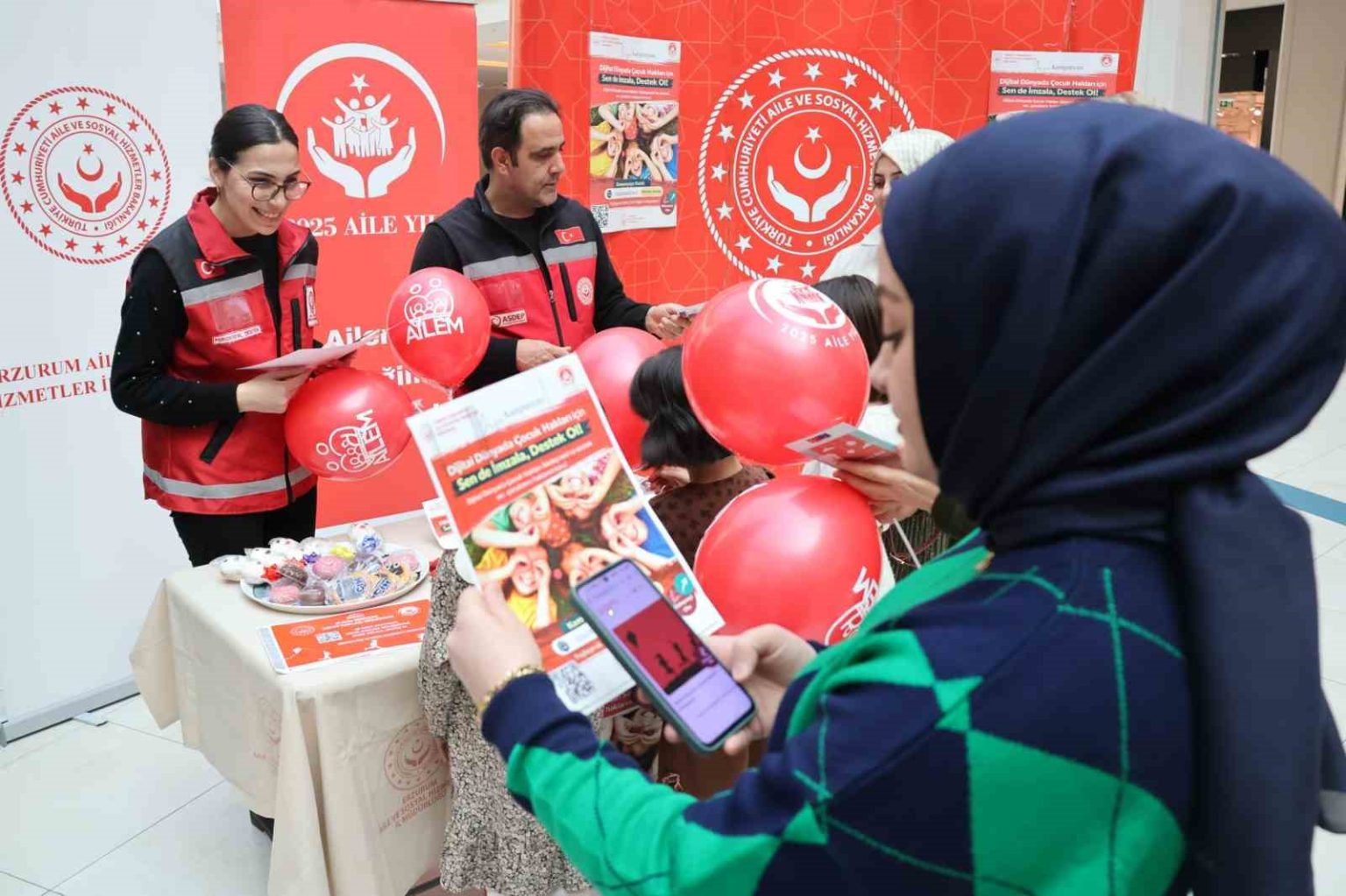 Erzurum’da bir alışveriş merkezinde kurulan stantta, Dijital Dünyada Çocuk Hakları Sözleşmesi hakkında bilgilendirme yapılırken, vatandaşlar kampanyaya imza ve destek vererek çocukların dijital dünyada güvenli bir şekilde var olmasına katkı sundu. Ailelere ve ziyaretçilere güvenli internet kullanımı, çocuk mahremiyeti ve dijital riskler konusunda bilgilendirici materyaller de dağıtıldı.