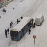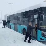 Kar nedeniyle ilerleyemeyen otobüslerdeki yolcular ve çevrede bulunan vatandaşlar araçlardan inerek otobüsleri itip yollarına devam etmelerini sağladı. O anlar cep telefonu kameralarına yansıdı.