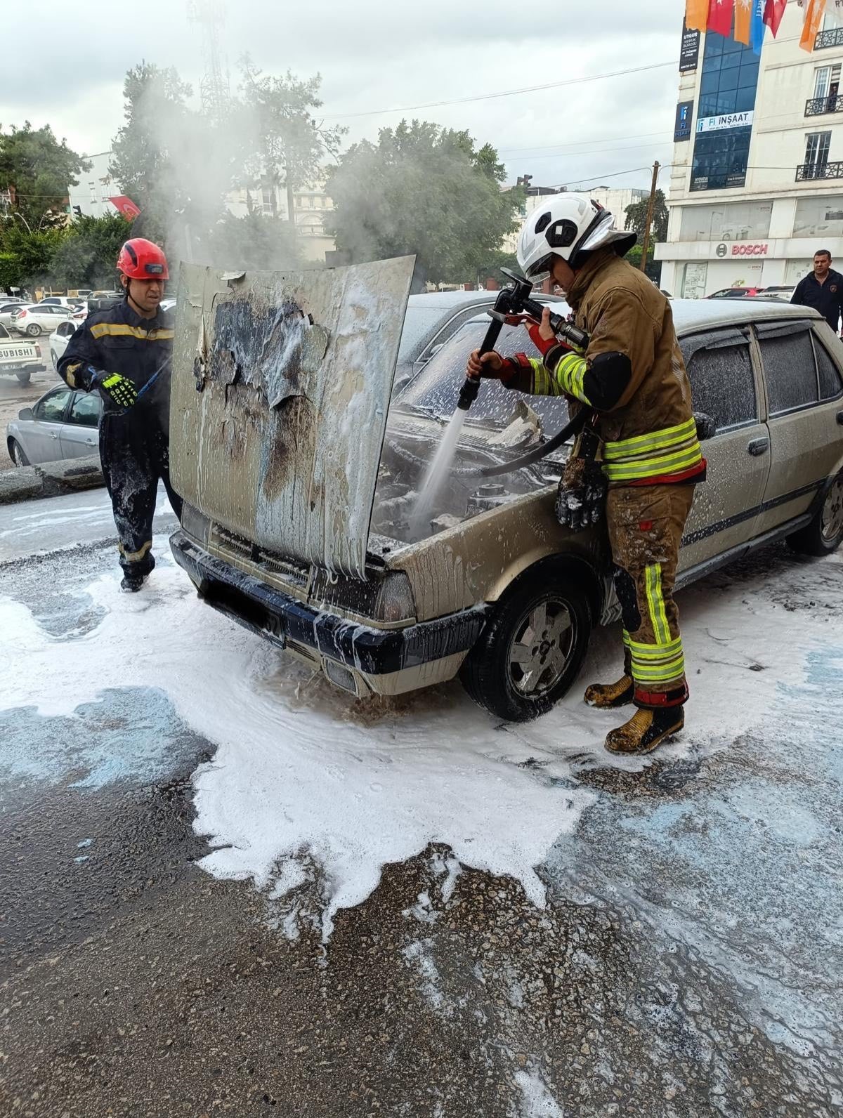 Hatay’da motor kısmı alevlere teslim olan TOFAŞ marka otomobilin motor kısmı alevlere teslim oldu.