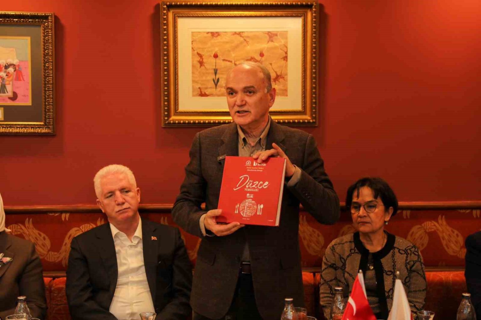Eşi Prof. Dr. Onur Özlü ile birlikte misafirlerini tek tek selamlayan Başkan Özlü, ikramların ardından yaptığı açıklamada, Düzce’nin gastronomi zenginliğini yerinde deneyimleme tavsiyelerinde bulunarak “Düzce’nin güneyinde çok sayıda yayla ve şelale var, kuzeyinde ise tarih ve Akçakoca’da deniz var. Biz yaklaşık 5-6 yıldır kazılar yapıyoruz. İstanbul’a en yakın antik tiyatro Düzce’dir. Ankara’ya en yakın deniz Akçakoca, Düzce’dir. 2019’da ben belediye başkanı seçildiğimde çok farklı demografik yapıya sahip Düzcelileri davet ettim. Evlerinizde yaptığınız yemekleri bize yapın, tariflerini verin, biz bunları kayda geçirelim dedim. İlk çalışmada yaklaşık 300 yemek çıktı ve bu 300 yemeği bir kitapta topladık. Bu Düzce Yemekleri Kitabı, burada ayrım yapmadık. Çünkü artık hepimiz nereden gelirsek gelelim artık Düzceliyiz. Dolayısıyla bunun adı Düzce Yemekleri Kitabı. Bu kitap çok sade bir şekilde hazırlandı. Burada yaklaşık 11 adet coğrafi işaretli yemeğimiz ve ürünümüz var. Dolayısıyla zengin bir mutfak var, kalıcı hale getirmeye çalıştık. Bu kitaptaki yemeklerin yapıldığı bir yer inşa ettik, Mutfak Sanatları Merkezi. Özgün bir yer oldu. Düzce’ye gelmenizi, bizi şereflendirmenizi istirham ediyorum” dedi.
