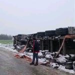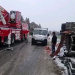 Edirne’de etkili olan kar yağışı ve fırtına nedeniyle yollar kayganlaştı. Tayakadın köyü yolu üzerinde 22 ADJ 186 plakalı yüklü tır, olumsuz hava şartları sebebiyle devrildi.