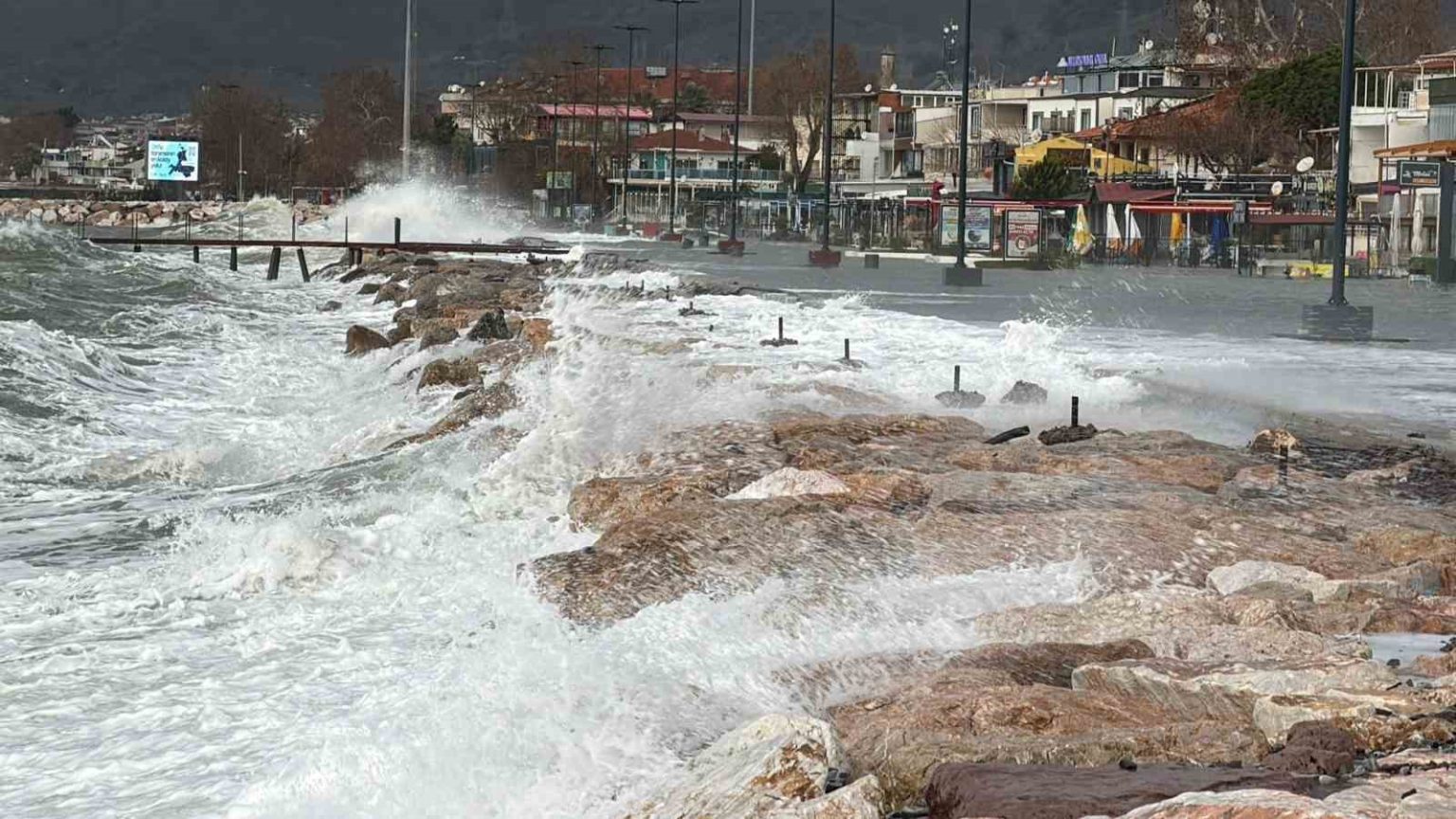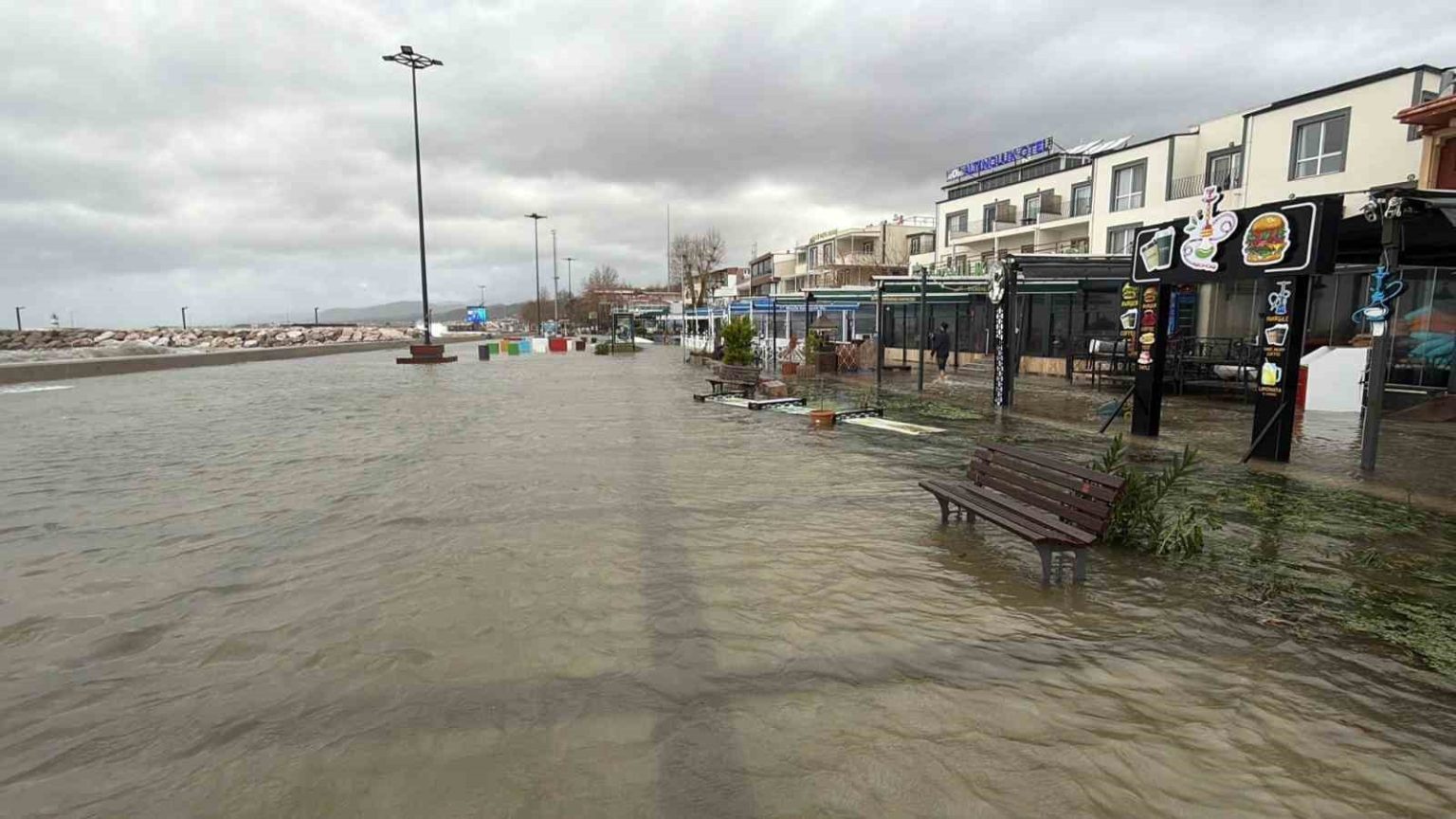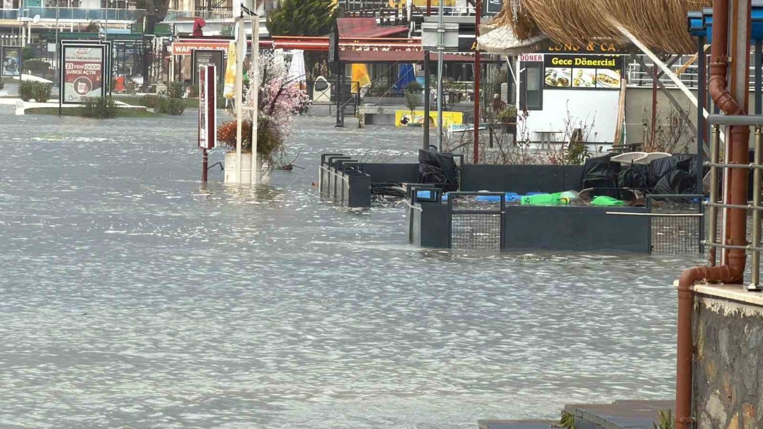 Balıkesir’in Edremit ilçesinde etkili olan şiddetli lodos fırtınası hayatı felç etti. Saatteki hızı 90 kilometreye ulaşan fırtına sebebiyle deniz taştı, turistik işletmeler sular altında kaldı. Kara ile denizin birleşmesi sonrası ekipler alarma geçti.