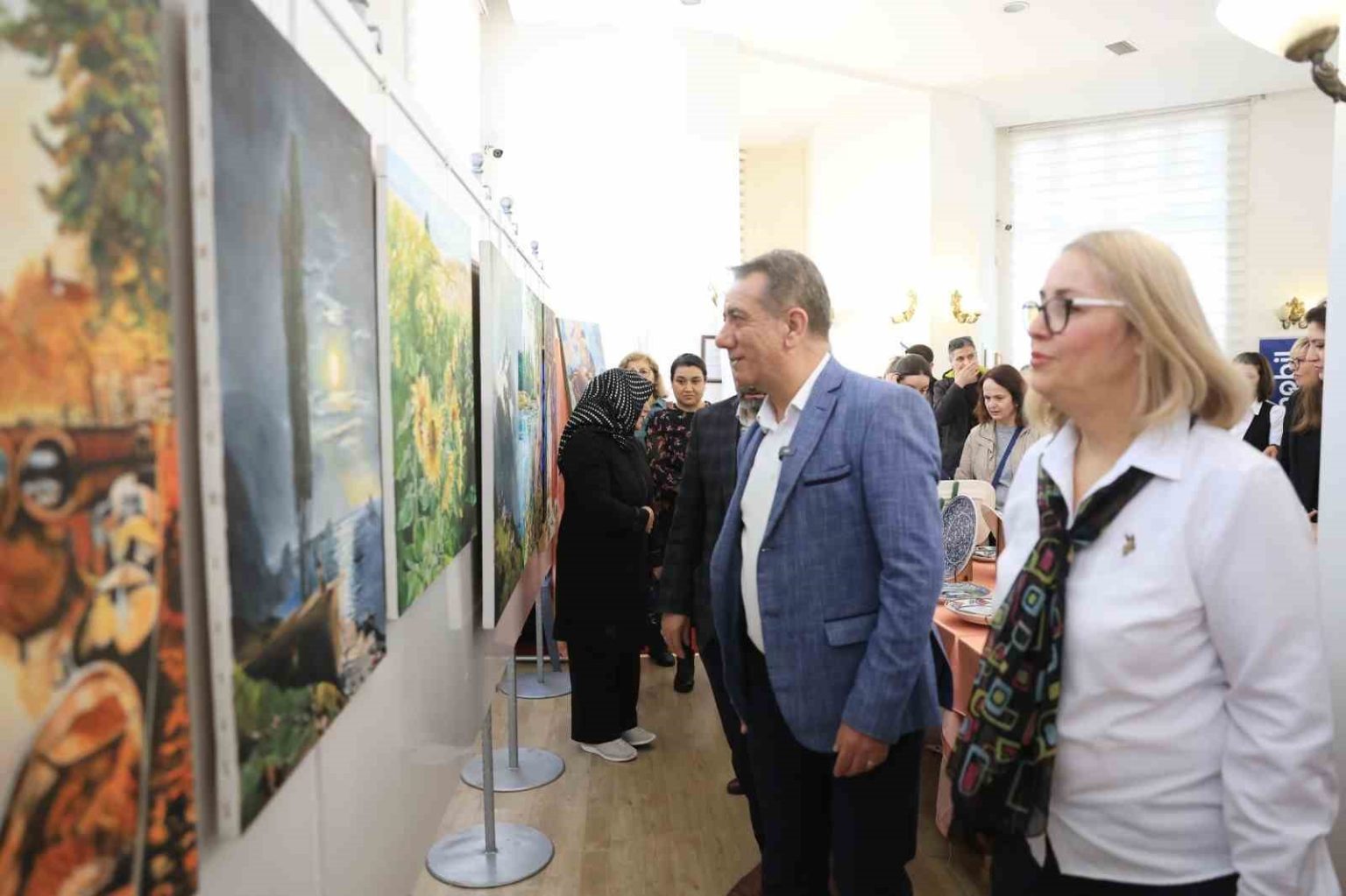 Efeler Belediyesi’nin sosyal belediyecilik anlayışıyla hayata geçirdiği kurslar, özellikle kadınların hem sosyalleşmesine hem de yeni beceriler kazanmasına önemli katkı sağlıyor. Bu kurslar sayesinde katılımcılar, yeteneklerini keşfetme fırsatı bulurken aynı zamanda el sanatları alanında kendilerini geliştirerek kalıcı eserler ortaya koyuyor. Efeler Belediyesi ile Efeler Halk Eğitim Merkezi iş birliğinde düzenlenen Resim ve Çini Kursu Sergisi düzenlenen tören ile açıldı. Serginin açılışını gerçekleştiren Efeler Belediye Başkanı Anıl Yetişkin, kursiyerlerin el emeği göz nuru eserlerini tek tek inceledi. Kursiyerlerle yakından ilgilenerek ortaya koydukları çalışmalardan dolayı kendilerini tebrik eten Yetişkin, kursiyerlerin sanata olan ilgisinin ve üretkenliğinin memnuniyet verici olduğunu ifade etti.