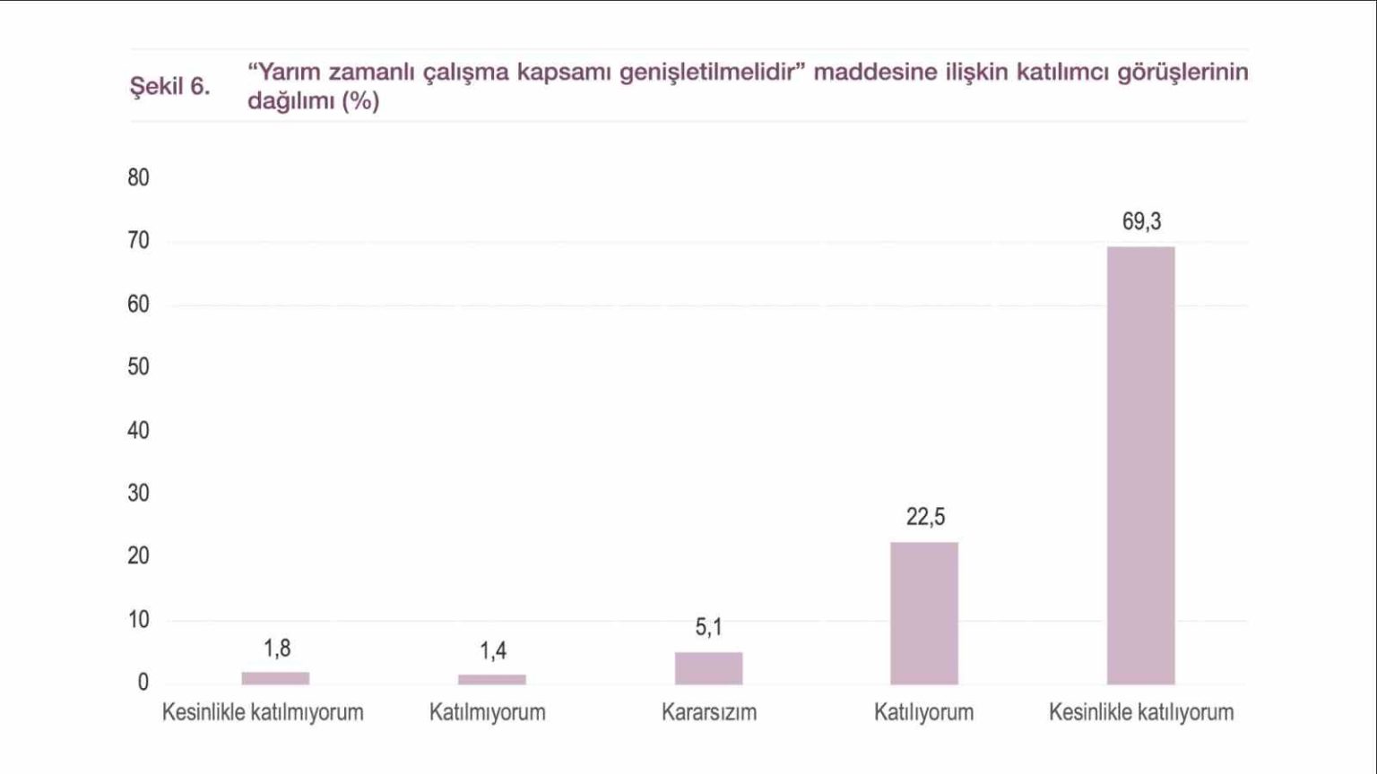 Mevcut doğum izninin 60 haftaya çıkarılmasını beklediklerini ve bu durumun kadının hem ev hayatına hem de iş hayatına adaptasyonunu olumlu yönde etkileyeceğini vurgulayan Aydın, “Mevcut doğum izni politikası, sahadaki gerçeklikle örtüşmüyor ve yeniden ele alınması gerekiyor. Araştırmamıza katılan katılımcıların yüzde 93’ü, doğum sonrası izin süresinin arttırılmasını gerekli görürken, yüzde 90’ı doğum izninin doğumdan önce 8, doğumdan sonra da 52 olmak üzere toplamda 60 haftaya çıkarılmasını talep ediyor. Bu durum bir ayrıcalık olarak görülmemeli. Bu sonuç bizlere kadınların hem anne hem çalışan olarak var olma talebini göstermeli. Doğum izni süreleri kadınların doğum sonrası fiziksel iyileşmesini, bebeğin gelişimini ve annenin psikolojik uyum sürecini karşılamaktan uzaktır. Kadınlar doğumdan çok kısa bir süre sonra işine dönmek zorunda kalıyor. Bebeğini, bakım sorumluluğunu yalnız başına taşımak zorunda kalıyor” şeklinde konuştu.