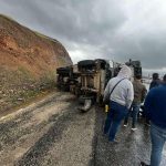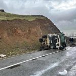 Elazığ’da yağıştan dolayı sürücüsünün direksiyon hakimiyetini kaybettiği beton pompa aracı yan yattı. Kazada 1 kişi yaralandı.