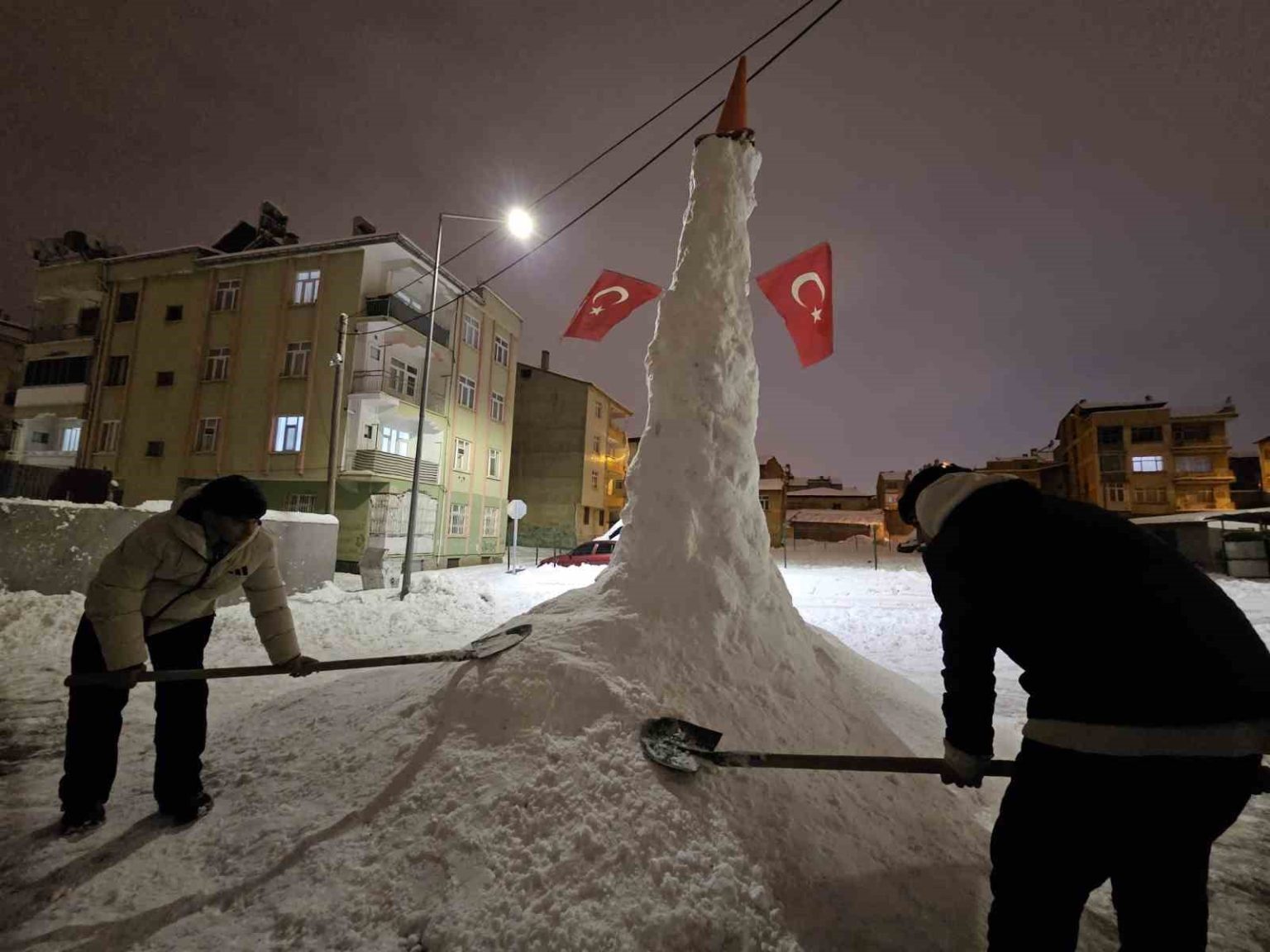 Arda Erulaş ise “Kar, kömür, duba ve bayrak kullandık. Kürek desteğiyle yaptık. Biraz abartalım dedik. Yaklaşık 4 ya da 4 buçuk metre oldu” ifadelerini kullandı.
