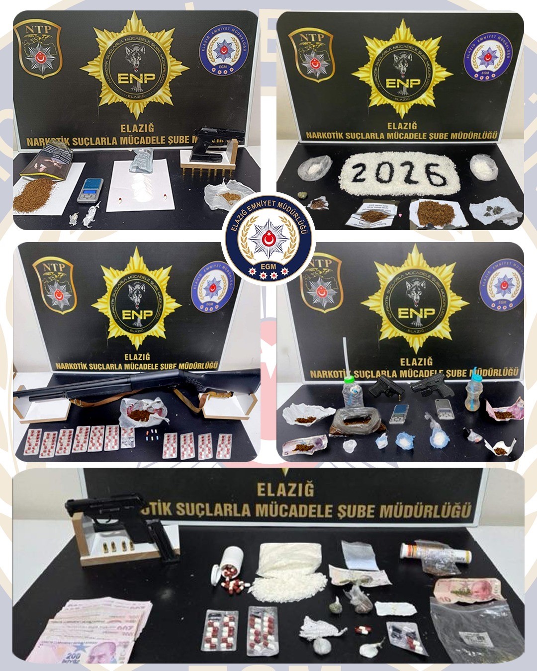 Elazığ Cumhuriyet Başsavcılığı koordinesinde İl Emniyet Müdürlüğü Narkotik Suçlarla Mücadele ve Asayiş Şube Müdürlüklerince uyuşturucu ile mücadele ve ruhsatsız silahların önlenmesine yönelik yılbaşından bu yana yürütülen çalışmalarda önemli miktarda suç unsuru ele geçirildi. Gerçekleştirilen operasyonlarda 27 parça halinde 1 kilo 221 gram metamfetamin, 32 parça halinde 527 gram sentetik kannabinoid, 6 parça halinde 117 gram kokain, 635 adet sentetik ecza, 10 parça halinde 49 gram esrar ile birlikte 3 adet hassas terazi ele geçirildi. Ayrıca operasyonlarda 15 adet ruhsatsız tabanca ve bu tabancalara ait 36 adet fişek ile 6 adet ruhsatsız tüfek ve 8 adet kartuşa el konuldu.