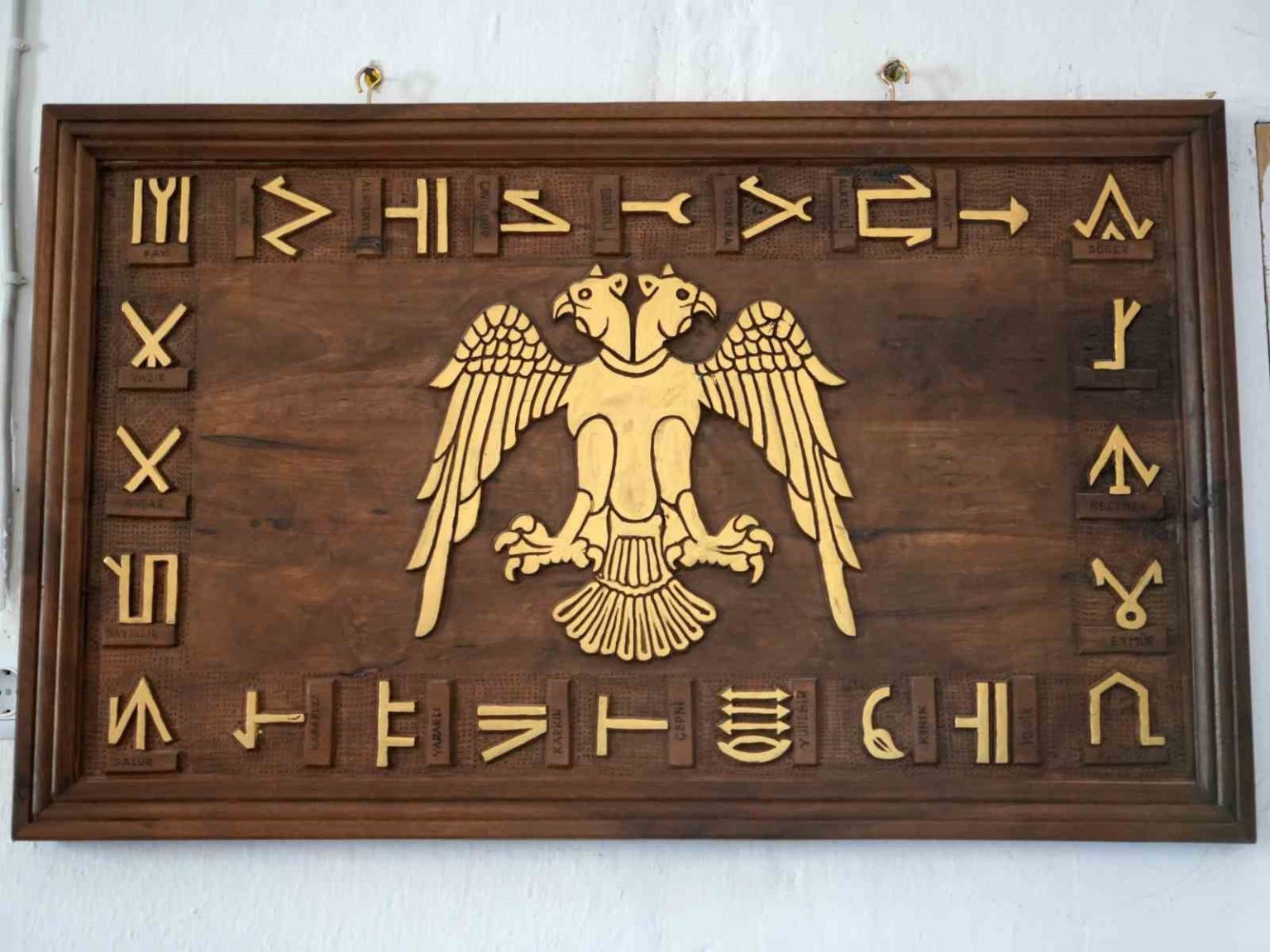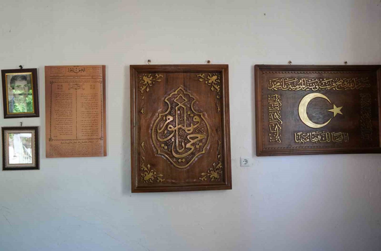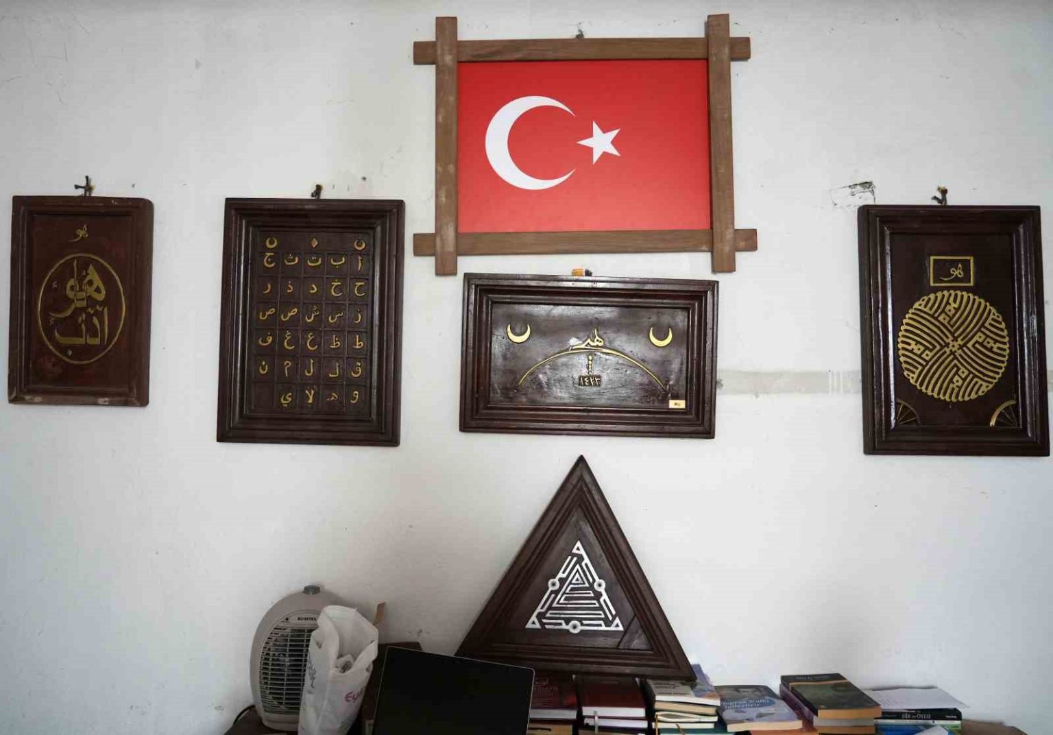 Hz. Pir Şeyh Şaban-ı Veli’nin türbesindeki hatların kendisine ilham olduğunu söyleyen Meşeoğlu, “Türbede baktım camekan içerisinde üçgen şeklinde bir yazı var, kufi şeklinde yazıyor. Öğrendim ki kenarlarda Muhammed, ortada Allah yazıyor. Ben, Sezai Karakoç’un şiirleriyle büyüdüm, şiirlerinde, ’kuşların yuvasına hak yol İslam yazacağız’ der. ’Bu üçgen bizim kültürümüzde yok, sen nereden buldun’ diyenler oldu. Ben, bu yazıyı 5 sene cebimde gezdirdim. En son sanayiye gittim, 7 levha yaptım. Öbür sene 20 levha yaptım. Benim ahşap oymada az çok bir becerim var. Hatta çocukluğumda ortaokula giderken ben bir mezarlık imalathanesinde çalıştım. O arada hilal içerisinde bozkurt resmi yaptım. Evimde 2 odanın duvarlarını oymalarla süsledim. Evimi müze haline getirdim” dedi.