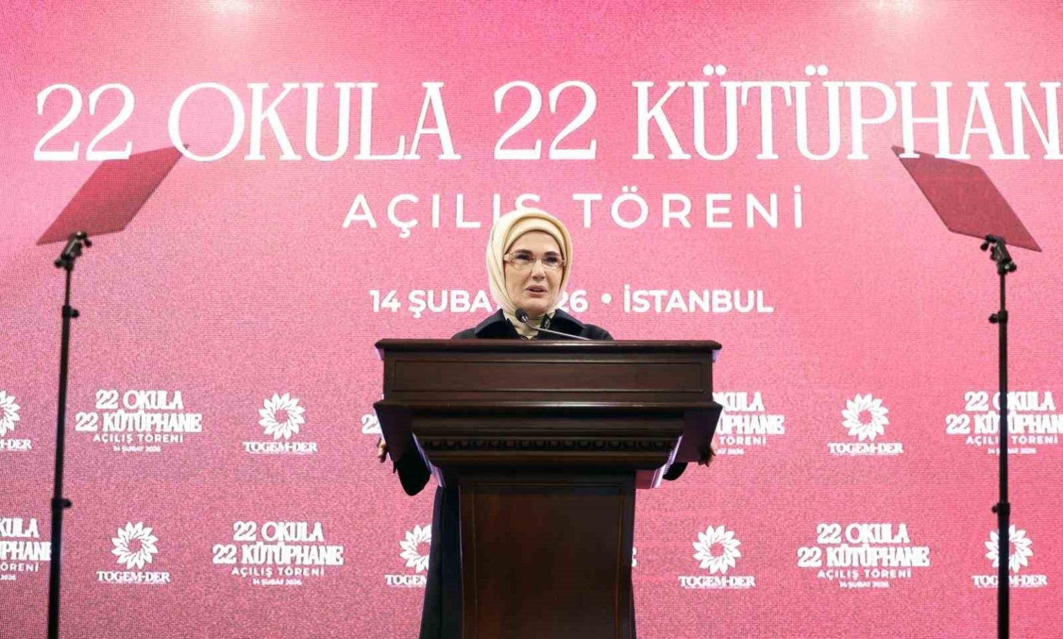 Cumhurbaşkanı Recep Tayyip Erdoğan’ın eşi Emine Erdoğan, “Kitapların hikmeti ve büyülü dünyasına bir kez adım attınız mı o dünyanın bir parçası olursunuz. İç aleminiz, fikir hayatınız, gönül eviniz ihya olur. Keşfedebileceklerinizin sınırsızlığını bilmek öğrenme aşkını her zaman taze tutar. O nedenle kütüphane okulların kalbidir, ruhudur, can damarıdır. Nitelikli kitaplarla dolu kütüphanelere sahip okullarda öğrenim bir takvime bağlı olmaktan çıkar; nefes alıp vermek gibi sürekli hale gelir. Ömür boyu devam edecek bir okuma ve öğrenme kültürüne dönüşür” dedi.