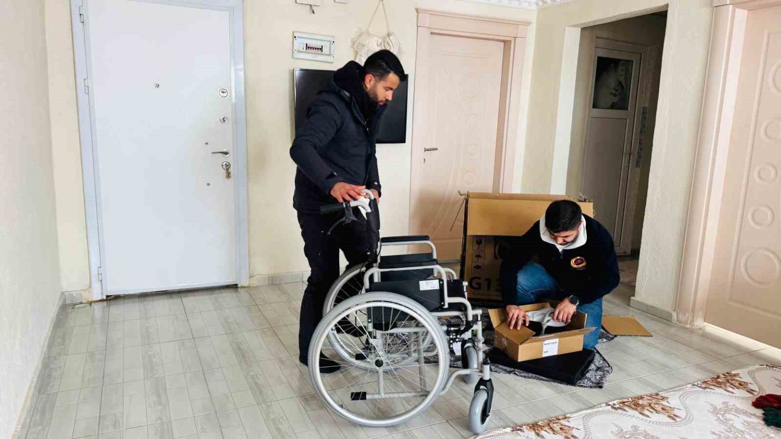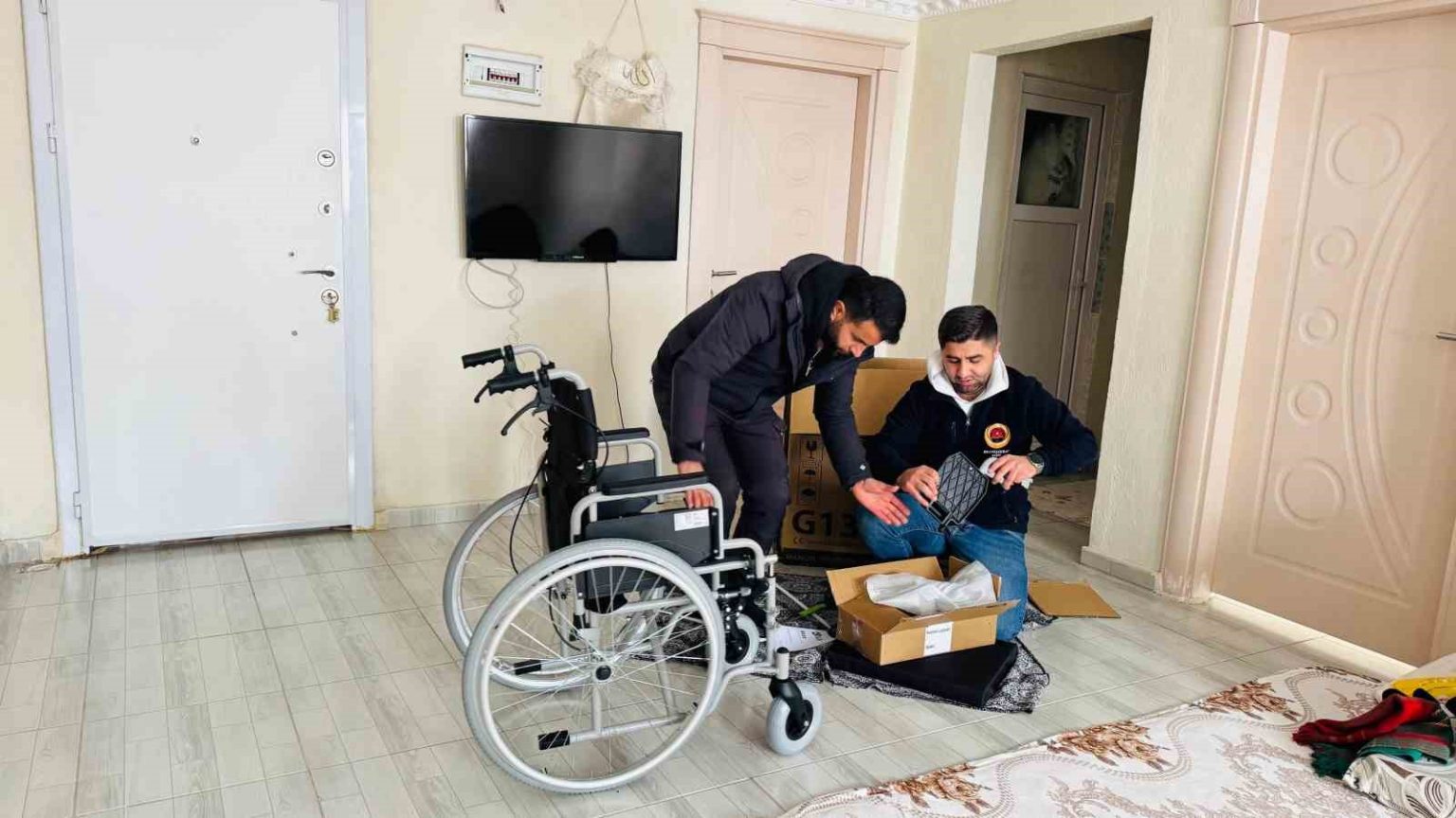 Polis memuru Şahin, Şırnak genelinde şimdiye kadar 100’den fazla akülü sandalye ve binlerce çocuk için bot, mont ve gıda yardımları yaptı.