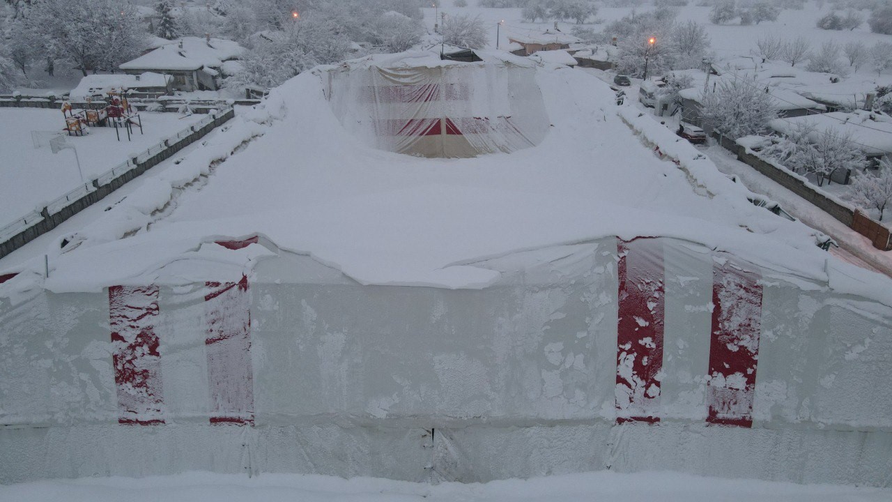 Erzincan’da kar birikintisi nedeniyle halı sahanın brandası çöktü, kimse zarar görmedi.