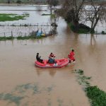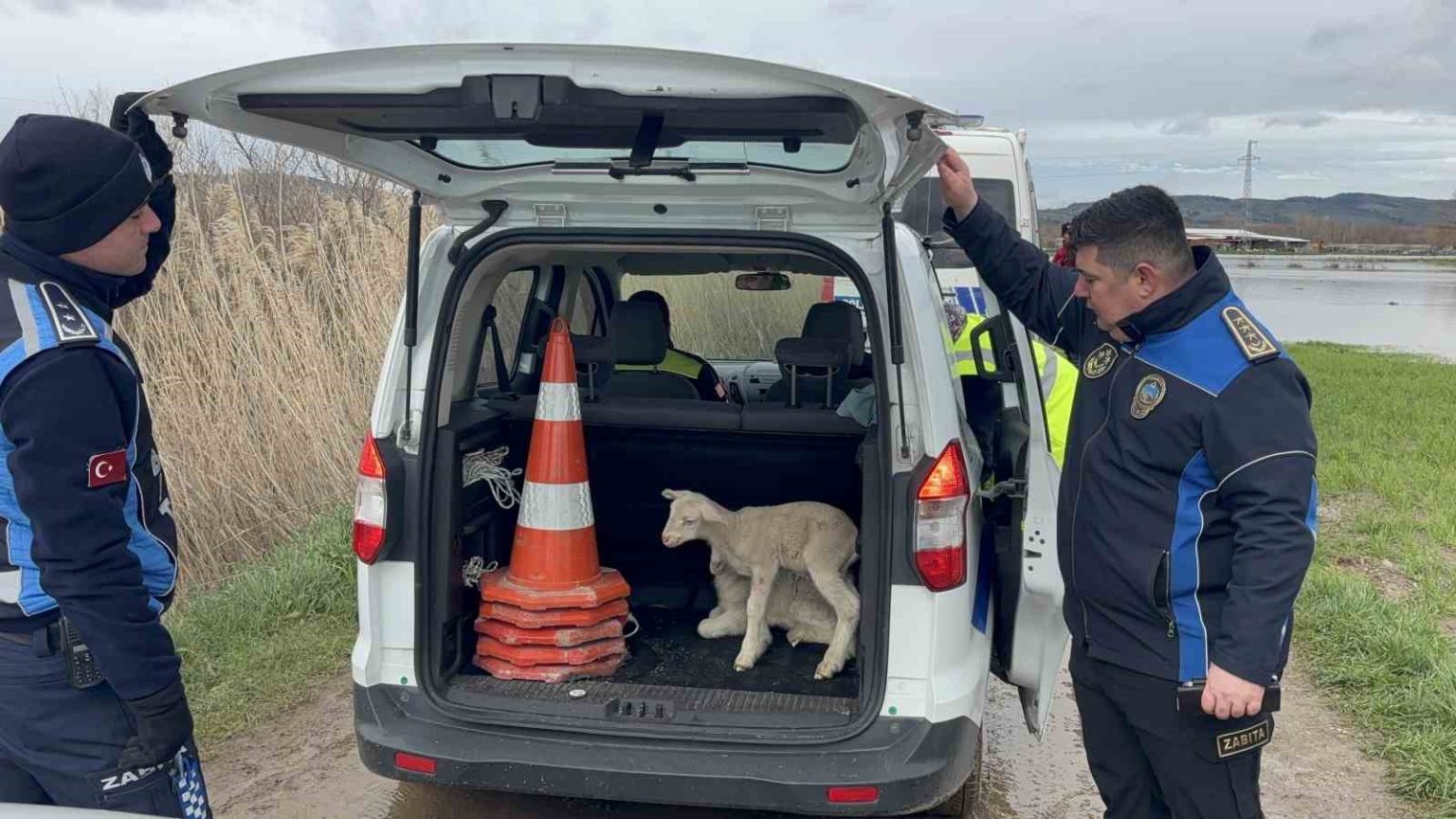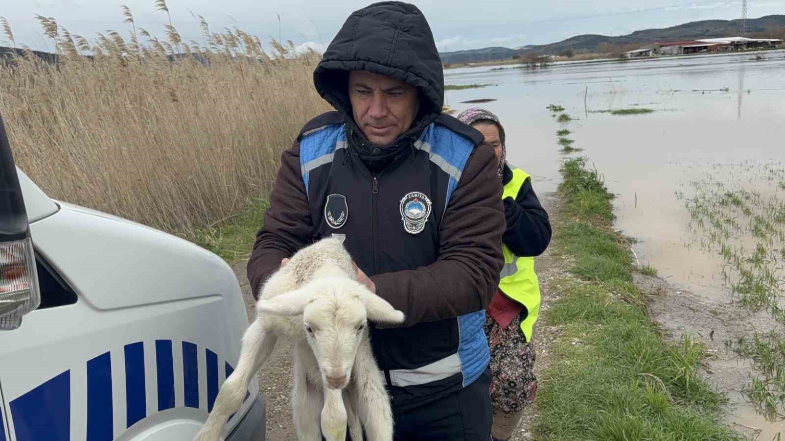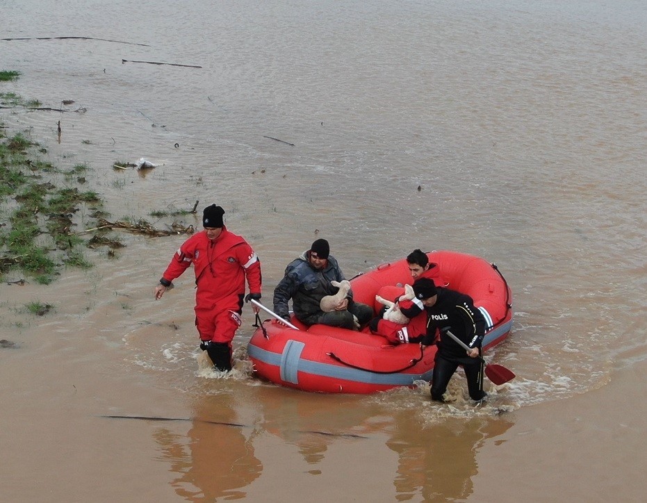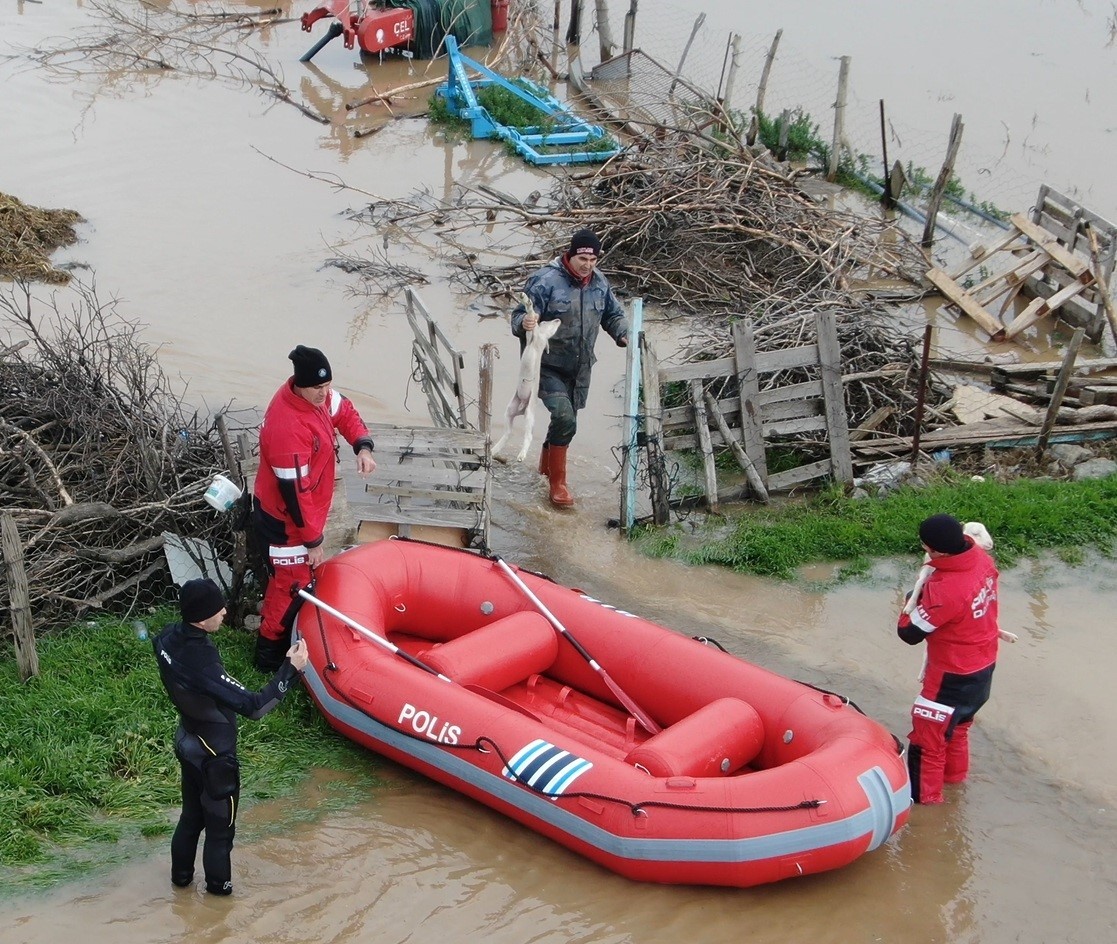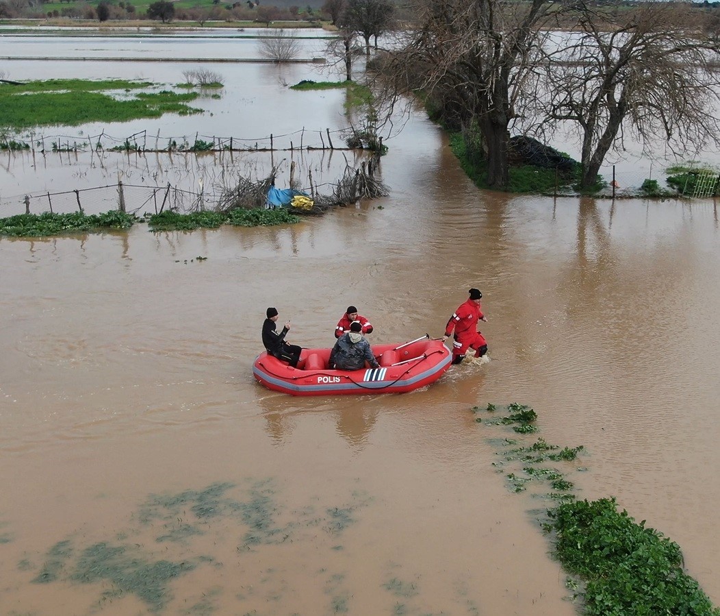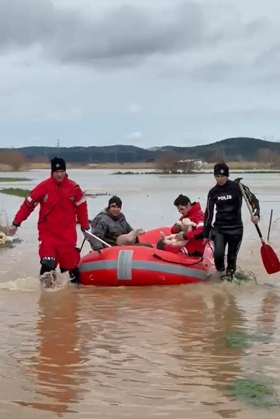 Ezine’de sağanak yağış nedeniyle Menderes Çayı taştı. Taşan çay nedeniyle bölgedeki tarım arazileri sular altında kaldı. İlçeye bağlı Güllüce köyü yolu üzerinde bir hayvan kışlası sular altında kaldı. İhbar üzerine bölgeye polis, itfaiye, zabıta, ambulans ekipleri sevk edildi. Polis su altı arama ve kurtarma ekipleri tarafından bot ile Şahin Avcı, yanında yeni doğan 2 kuzu ile birlikte kurtarıldı. Kurtarma anı dron ile görüntülendi. Avcı’nın sağlık durumunun iyi olduğu öğrenildi.
