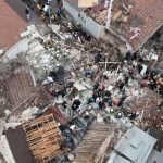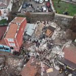 Fatih’te bilinmeyen bir nedenle bitişik halde bulunan 2 gece kondu çöktü. Göçük altında mahsur kalanları kurtarma çalışması havadan görüntülendi.