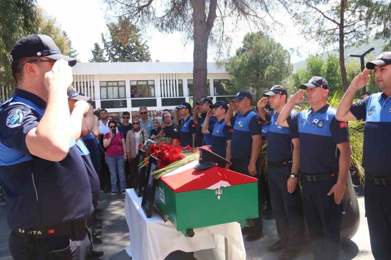 Geçirdiği kalp krizi dolayısıyla hayatını kaybeden Fethiye Belediyesi zabıta personeli Kerem Ersoy için belediye binası önünde tören düzenlendi.