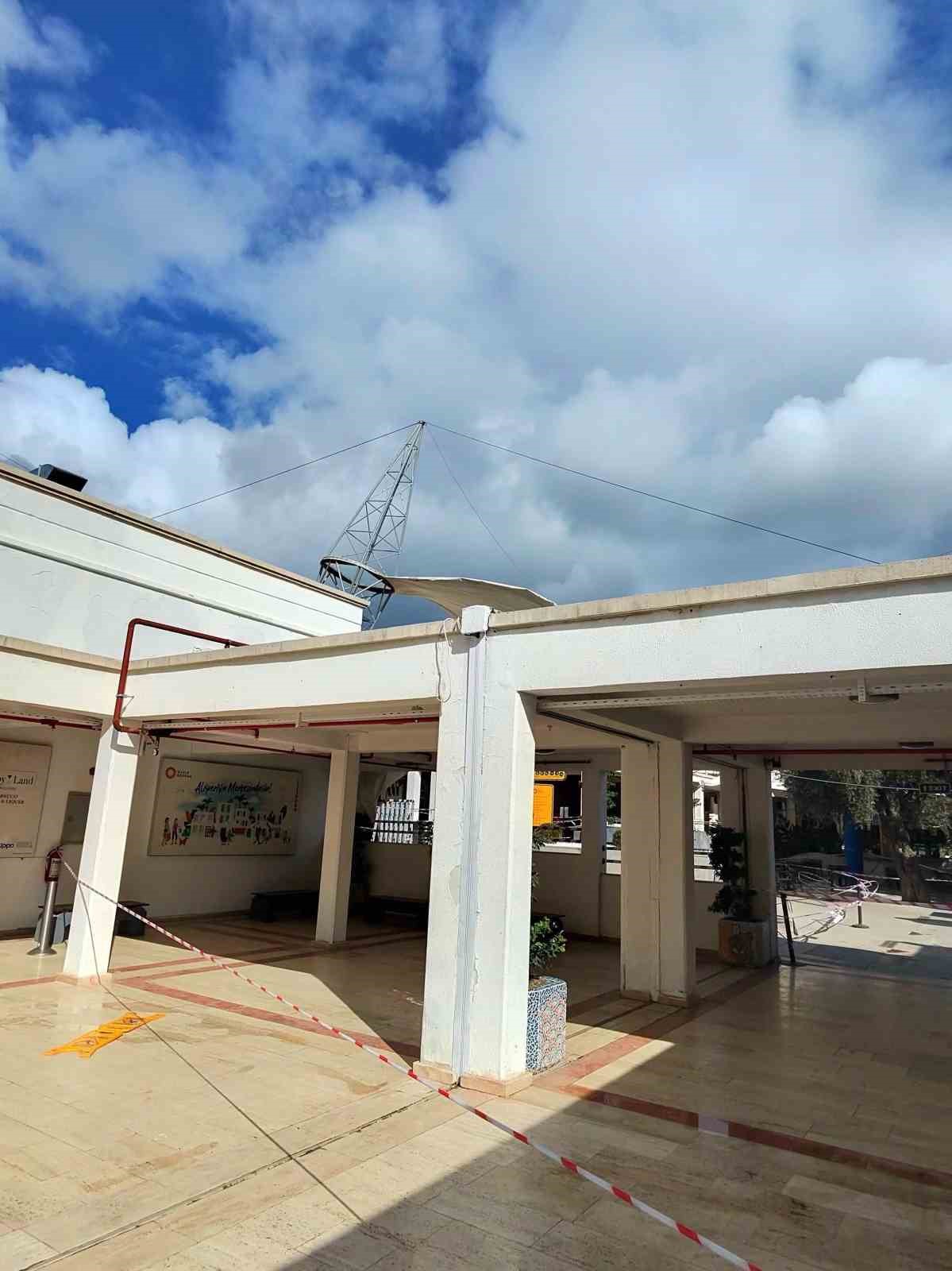 Muğla’nın Bodrum ilçesinde bulunan Oasis Alışveriş Merkezi, fırtınanın ardından ortaya çıkan tehlike nedeniyle kısmen kapatıldı. Şiddetli rüzgarın etkisiyle kopan brandalar ve yerinden oynamaya başlayan demir direkler, AVM içinde can güvenliğini tehdit etti.