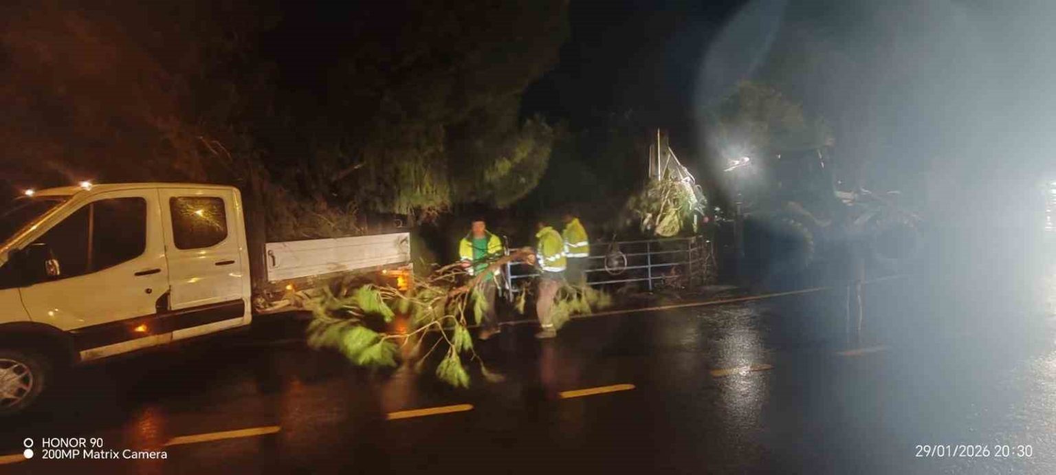 Aydın’ın Germencik ilçesinde etkili olan şiddetli yağış ve fırtına nedeniyle Mursallı Mezarlığı’ndaki ağaçlar devrilirken, Germencik Belediyesi ekiplerinin hızlı müdahalesi muhtemel zararların önüne geçti.