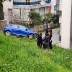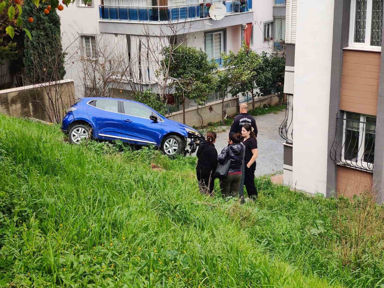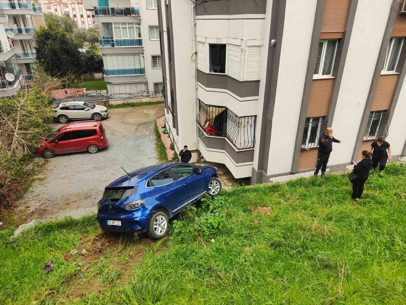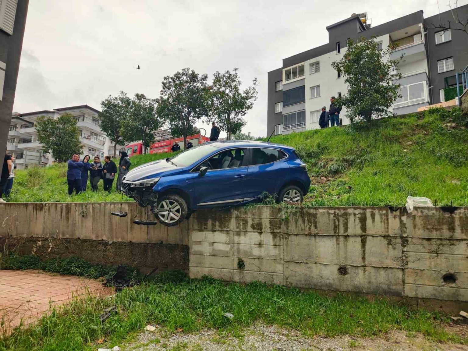 Aydın’ın Kuşadası ilçesinde iddiaya göre sürücünün fren yerine gaza basması sonucu kontrolden çıkan araç bir sitenin bahçesine yuvarlandı.