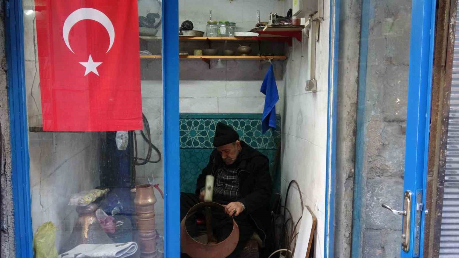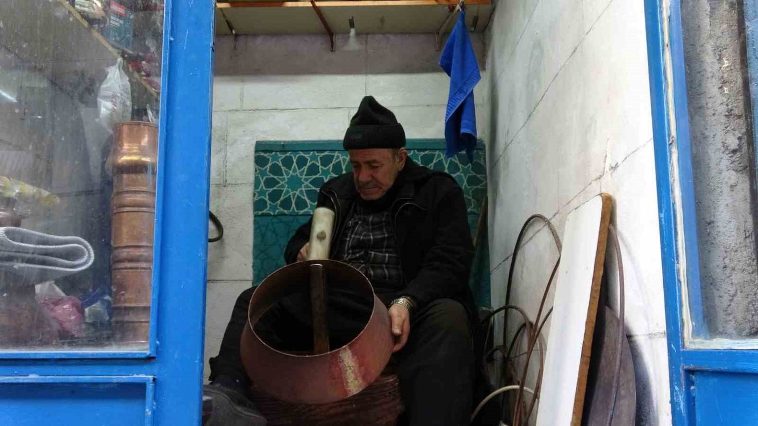 Dükkanında bakır işleyip, eski bakırların tadilatını yaparak geçimini sağlayan Çelik, ilerleyen yaşına rağmen çalışmadan duramıyor.