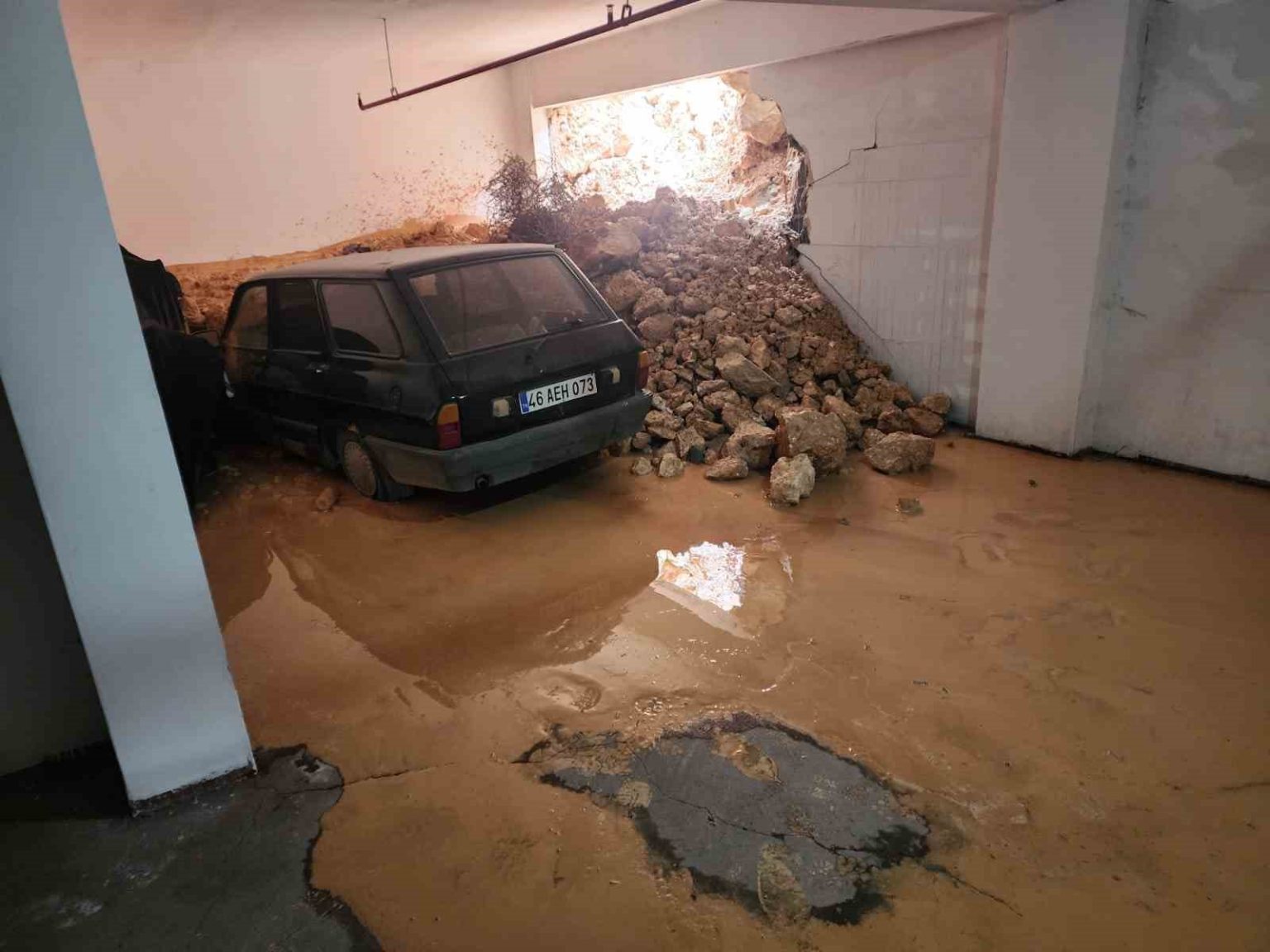 Gaziantep’te 2 gündür etkili olan şiddetli yağmur nedeniyle 7 katlı bir binanın zemin katındaki duvar yıkıldı. Binanın zeminini su basması sonucu garajdaki araç çamur altında kaldı.