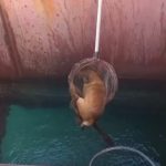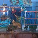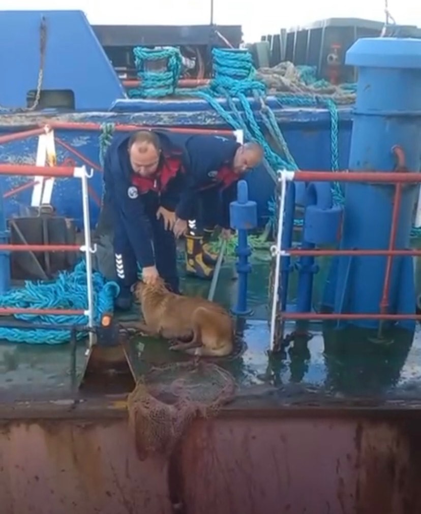Hatay’da balıkçı barınağında geminin denize açılan havuzuna düşerek mahsur kalan köpeği itfaiye kurtardı.