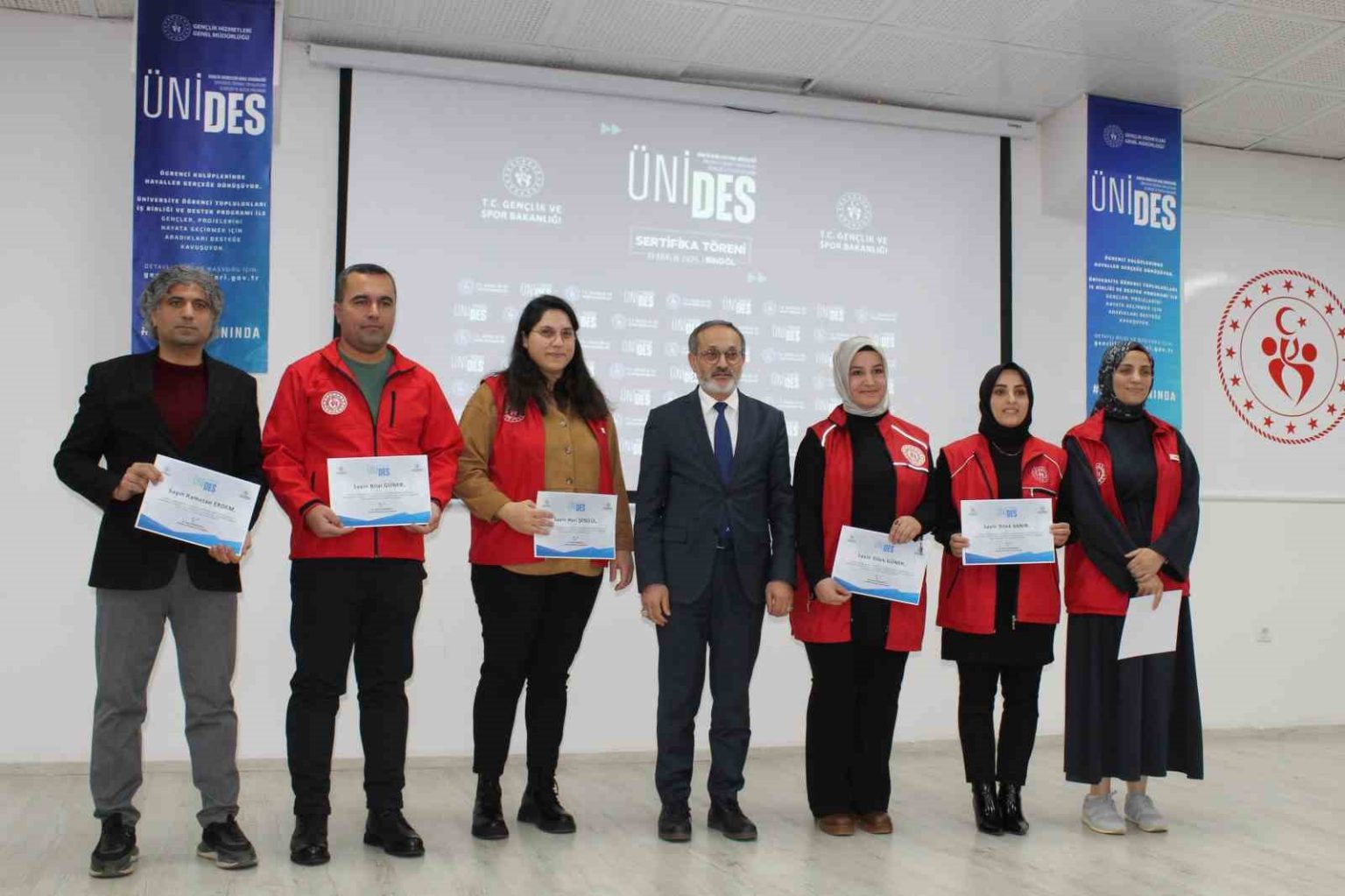 Bingöl’de, Gençlik ve Spor Bakanlığı Gençlik Hizmetleri Genel Müdürlüğü tarafından yürütülen Üniversite Öğrenci Toplulukları İş Birliği ve Destek Programı (UNİDES) kapsamında hayata geçirilen projelerde yer alan üniversite öğrencileri için sertifika töreni düzenlendi. Bingöl Gençlik ve Spor İl Müdürlüğü koordinasyonunda gerçekleştirilen törende, üniversite öğrenci topluluklarının aktif katkıları, akademisyenlerin rehberliği ve proje koordinatörlerinin özverisiyle yürütülen çalışmalarda görev alan öğrencilere sertifikaları takdim edildi. Törende sertifikalar; Bingöl Valisi Dr. Ahmet Hamdi Usta, Bingöl Belediye Başkanı Erdal Arıkan, İl Jandarma Komutanı Tuğgeneral Sabri Küyük ve kurum amirleri tarafından verildi.