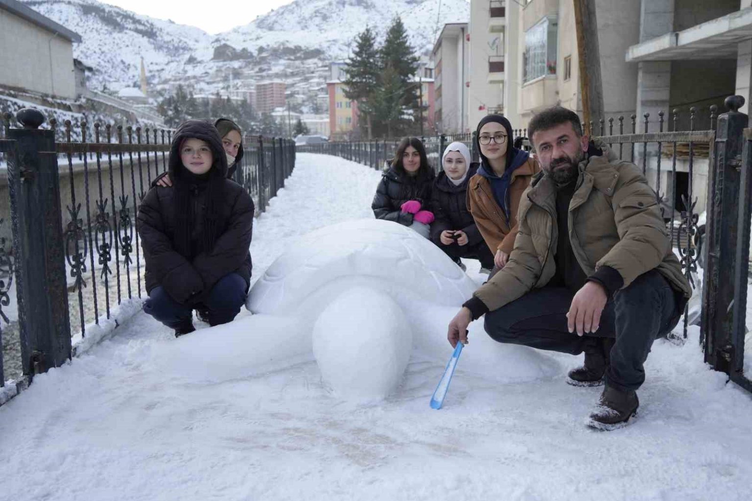 Gümüşhane’de tır şoförü Cihan Oral, çocuklarıyla birlikte yaptığı kardan kaplumbağa heykeliyle ilgi odağı oldu.