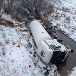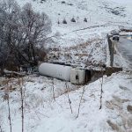 Gümüşhane’de buzlanan yolda kontrolden çıkan LPG yüklü tanker dere yatağına devrildi.